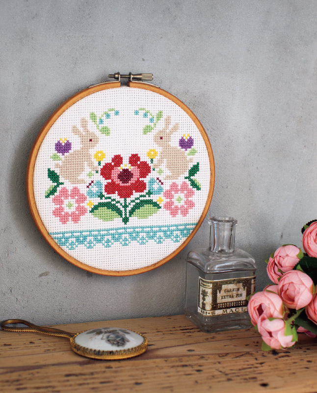 【糸セット】《ウサギと花のカロチャ風フレーム》「刺しゅうの時間 vol.2」掲載(kit-0079)
