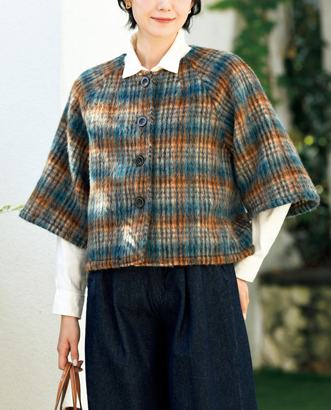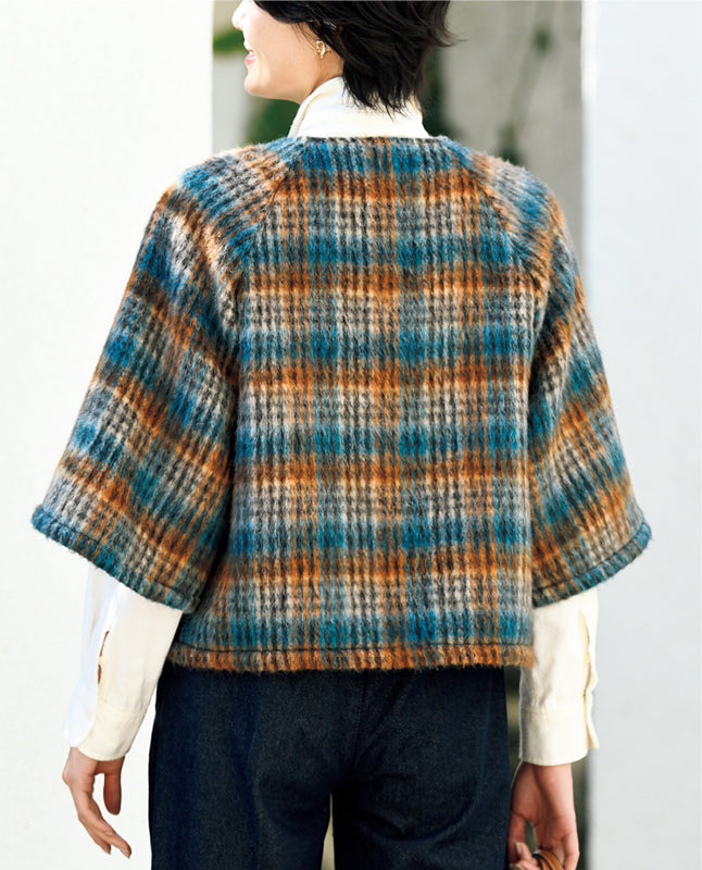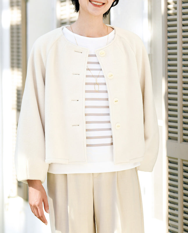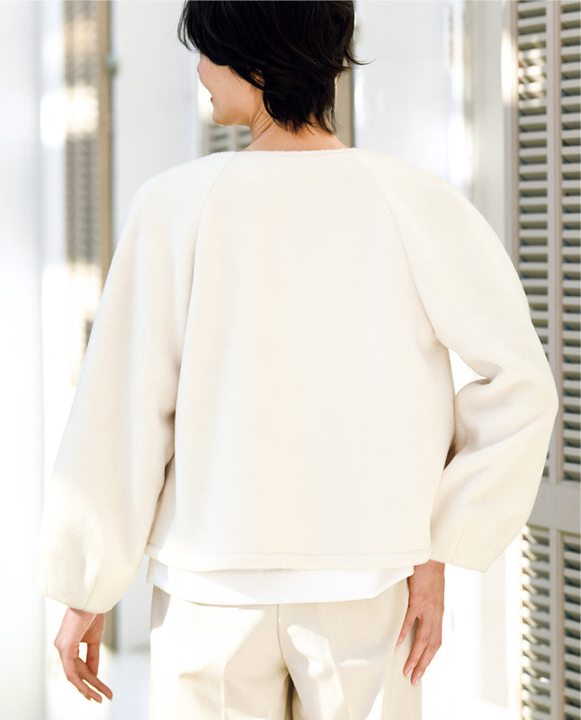 スタイルアップして見えるショートジャケット。七分丈のフレアスリーブにすることで、一見ケープのようなフォルムに仕上げました。さまざまなインナーとの重ね着を楽しめるデザイン。素材は裏なしでもあたたかい、毛足のあるシャギーを使用しています。