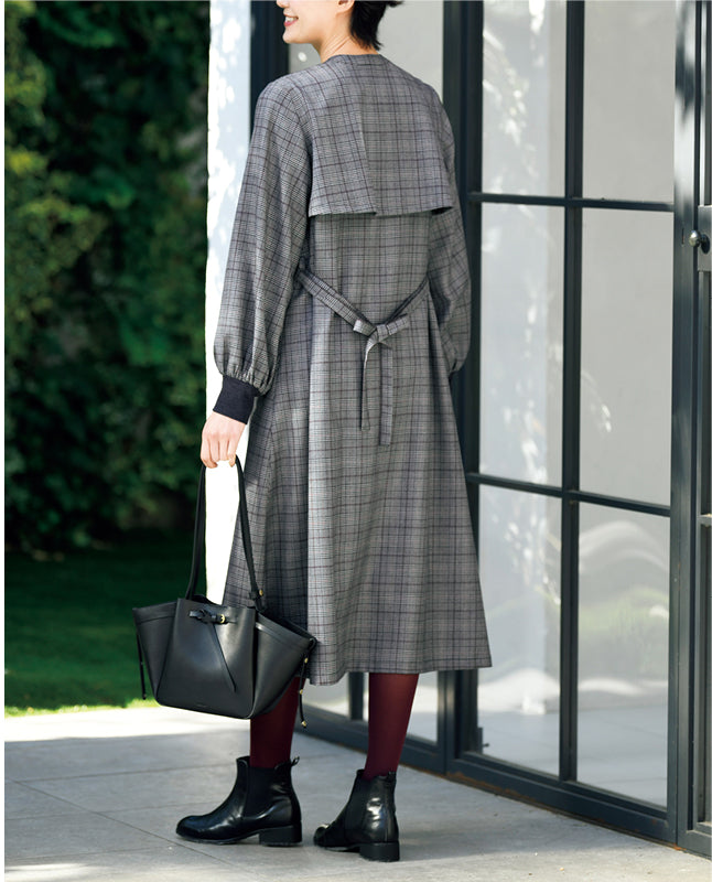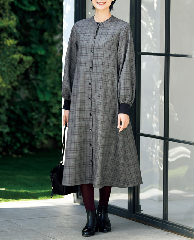 袖口をニット地のカフスでキュッと引き締め、ふんわりとふくらませたパフスリーブ。無地のカフスが絶妙なアクセントになっています。ウエストのひもベルトを後ろで軽く結び、ゆったりとしたフォルムで着こなすのも素敵です。