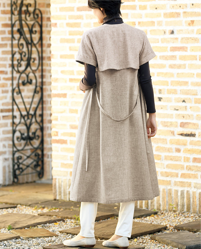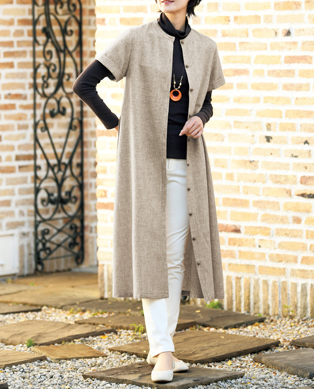 袖口をターンアップした半袖のデザイン。春や秋口には一枚で着てももちろんOK。冬から早春にかけてはインナーを合わせ、ロングベスト感覚で着こなすのも素敵です。