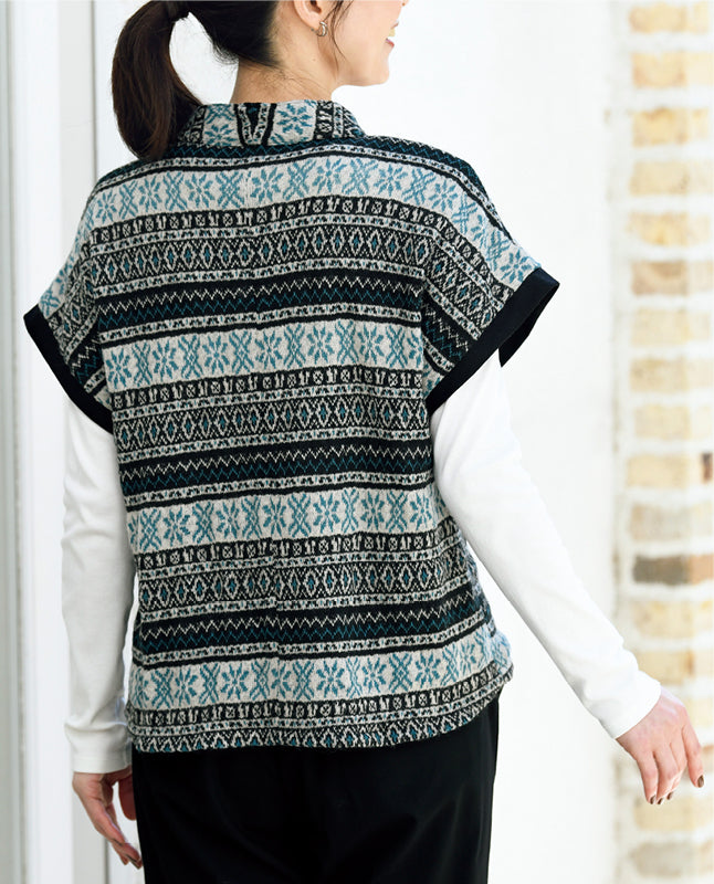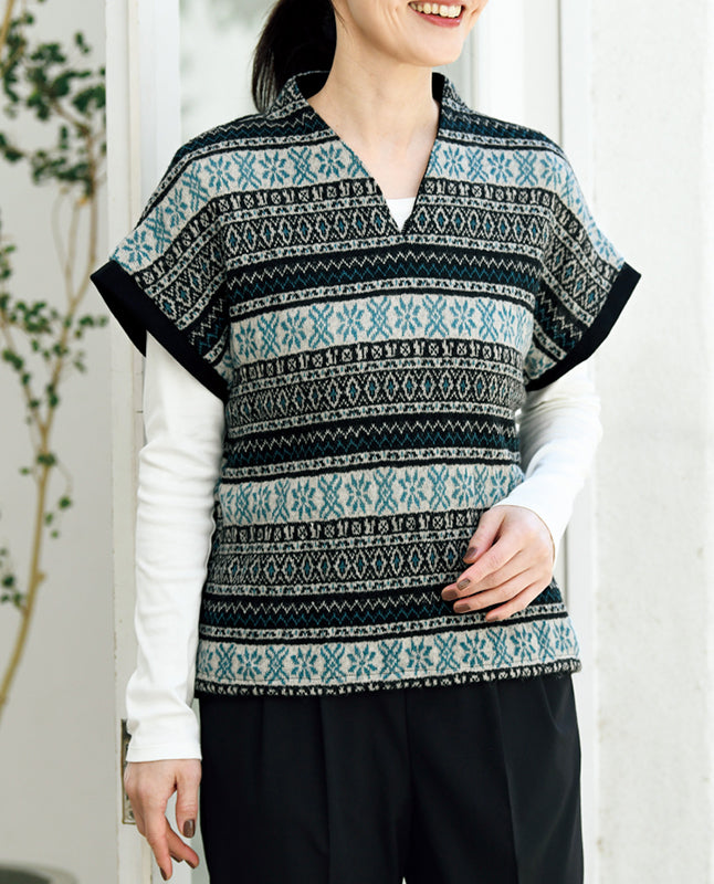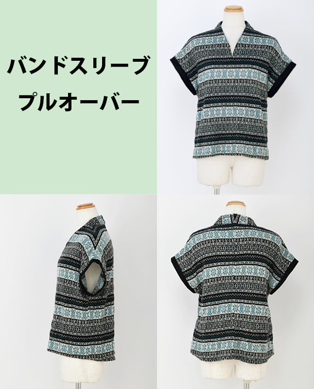 細い袖を縫い付けたバンドスリーブ。インナーを合わせたレイヤードスタイルも楽しめる一着です。軽快なノルディック柄は装いのアクセントにぴったり。袖は黒の無地を使い、全体を引き締めるスパイスに。