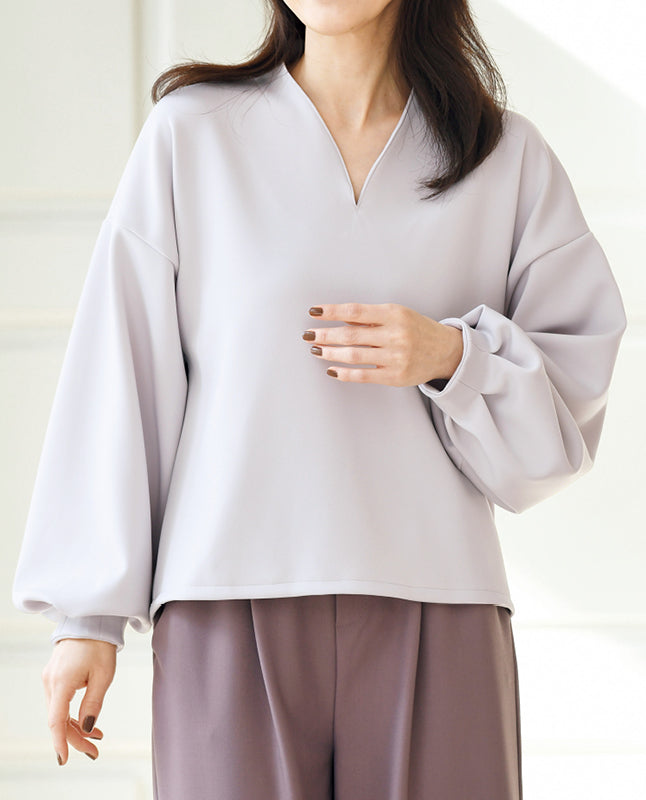 後ろは高く首に沿わせ、前はVネックですっきり小顔&華奢見え効果を狙ったプルオーバー。デザインポイントの首元が際立つよう、袖はシンプルに仕上げました。ドロップショルダーなので締め付け感も少なく快適な着心地。