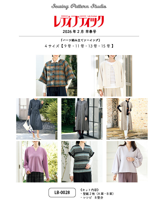 2026年2月早春号のレディブティックで大人気のテーマ『パーツ組み立てソーイング』の作品8型分の型紙とレシピがセットになりました。サイズは、9・11・13・15号の4サイズ展開。