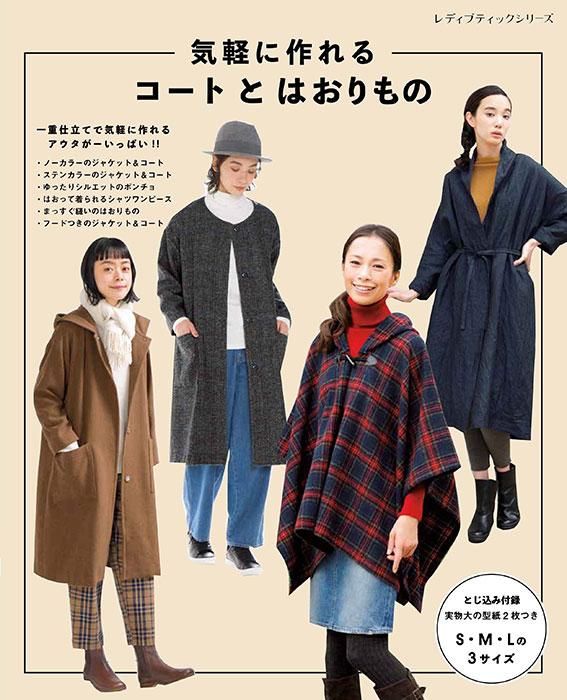 一重仕立てで気軽に作れるアウターが満載。ノーカラーやステンカラー、ポンチョ、はおって着られるシャツワンピース、まっすぐ縫いのデザイン、フードつきなど秋冬春に活躍するコートとはおりものを紹介。S・M・Lの3サイズ。実物大の型紙2枚つき。