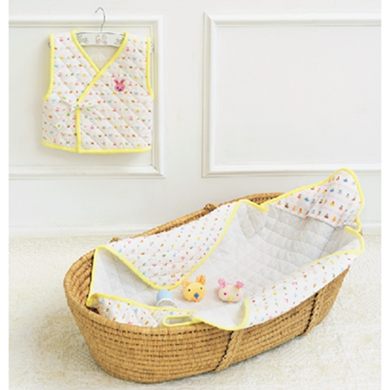 ダブルガーゼのキルティング地でつくったベストとおくるみは、まわりをニットのふちどりテープでくるんで仕上げます。どちらも肌寒い日やお風呂上がりにさっと着せたりくるんだり、ねんねのころから大活躍するアイテムです。