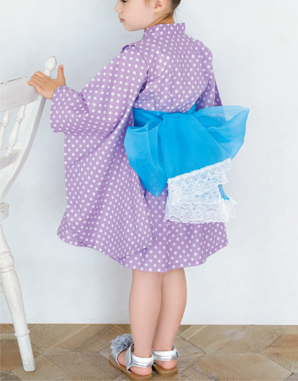 水玉模様の生地で作ると、一味違った雰囲気になります。帯は市販のへこ帯を合わせて軽やかに。