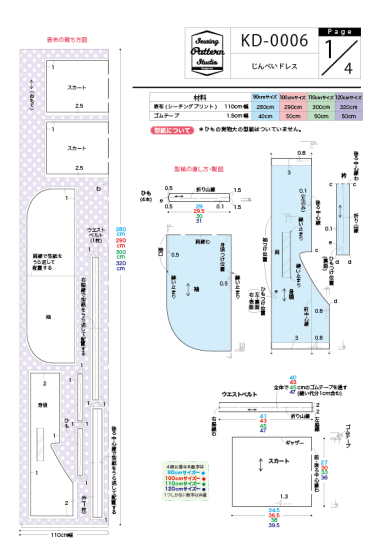 【型紙】(A4サイズ) 90サイズ16枚 / 100サイズ16枚 / 110サイズ18枚 / 120サイズ21枚 (貼り合わせてお使いください)