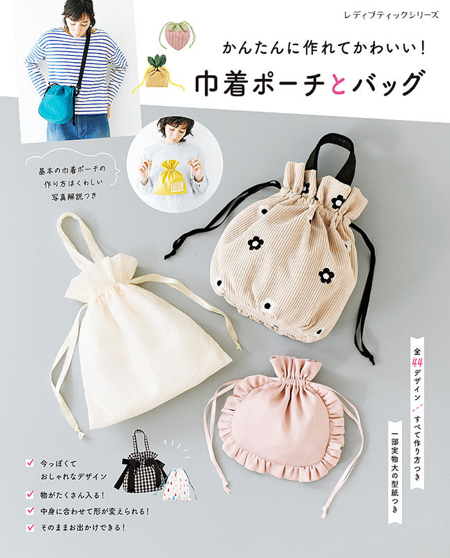 初心者でも手作りしやすく、開け閉めもかんたんで便利な巾着タイプのポーチとバッグの本。1枚でまっすぐ縫って作るシンプルなものから、裏布つき、マチつき、形のアレンジ、バッグのバリエーションなど、使いやすくておしゃれなデザインを掲載。くわしいプロセス写真解説つき。AB判(260×210mm)