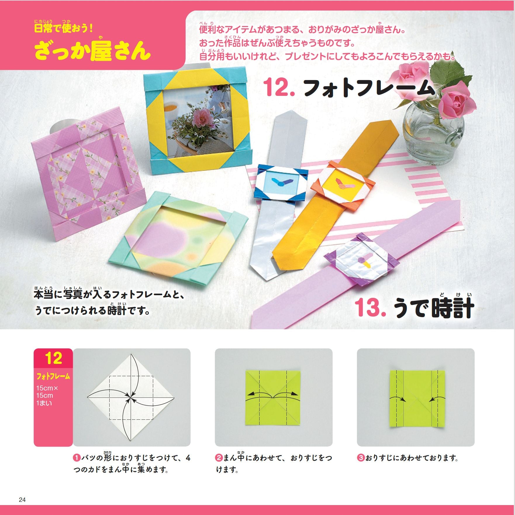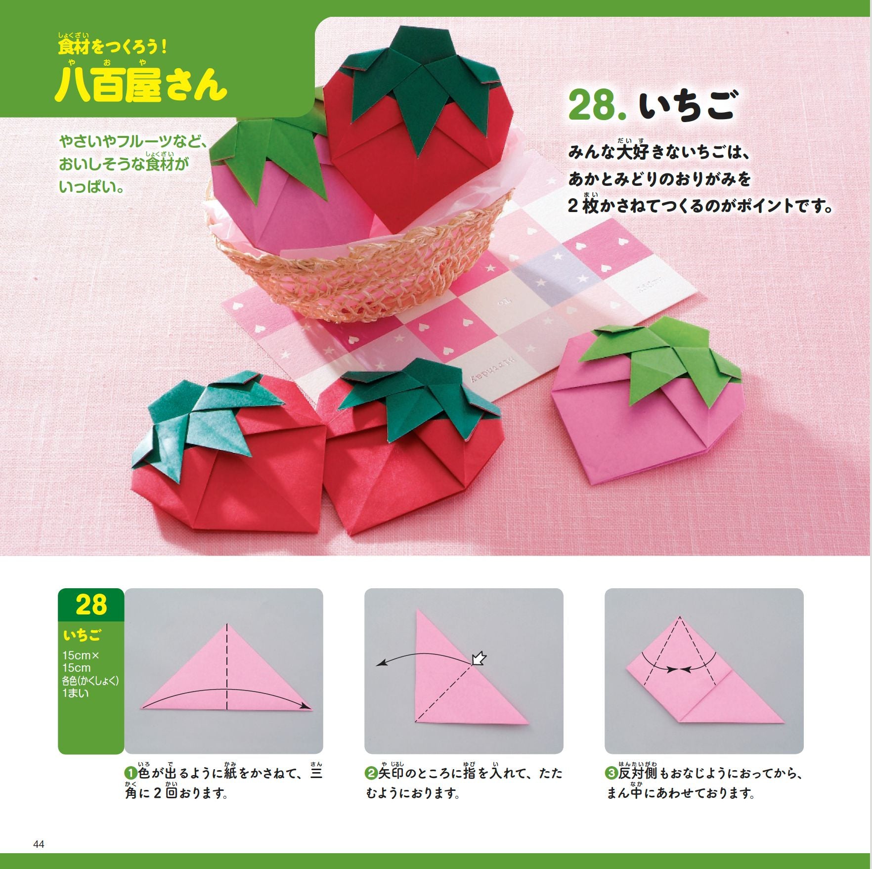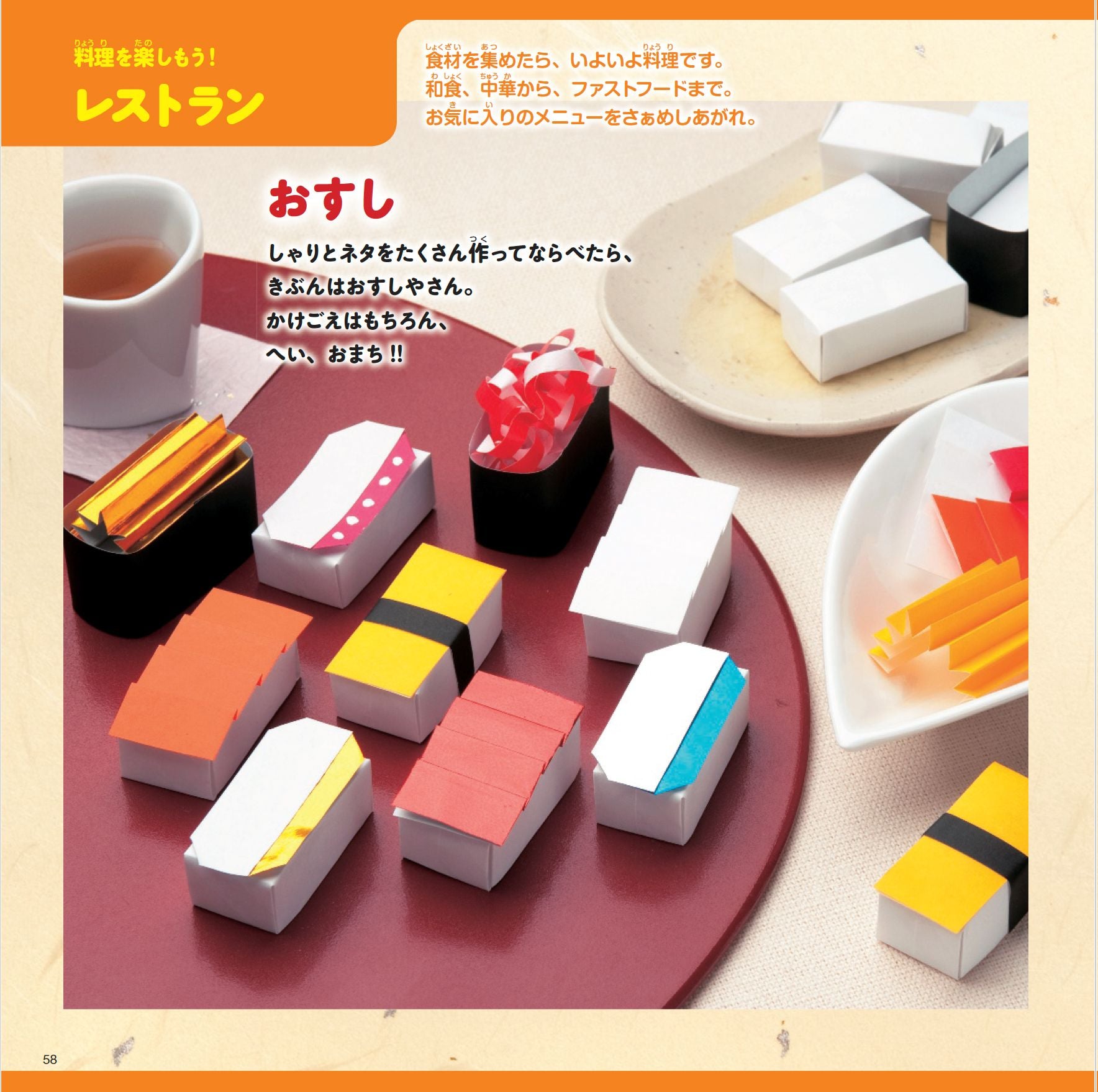 飛ばして遊べるヒコーキ、おままごとにぴったりの野菜や料理、お皿、フライパン、使って楽しめる折り紙手紙など、折ってからが楽しい折り紙が満載!折り方はすべて写真で説明しているから、子どもでもひとりで折れるよ。寺西恵里子著