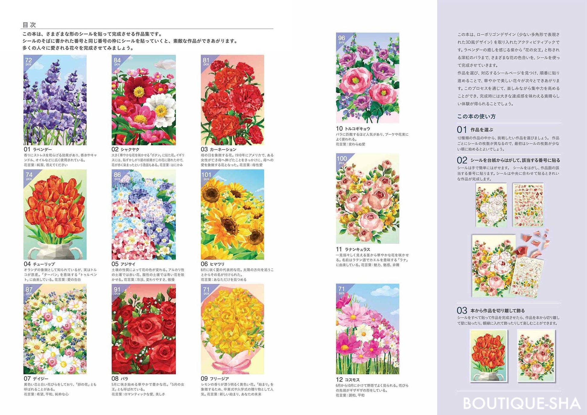 作品を選び、対応するシールページを見つけ、順番に貼り進めることで、華やかで美しい花々が次々とできあがります。