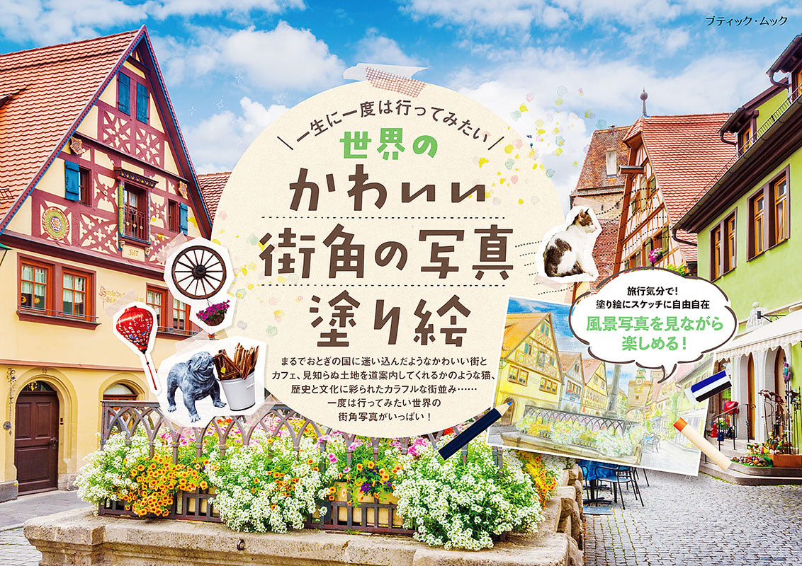 一度は行ってみたい、世界の綺麗でかわいい街並みや建物、カフェ、猫のいる風景など絶景スポットの塗り絵集。左ページのお手本写真を見ながら塗ることができる。写真をお手本にすることで、リアルに旅行気分を味わえる。