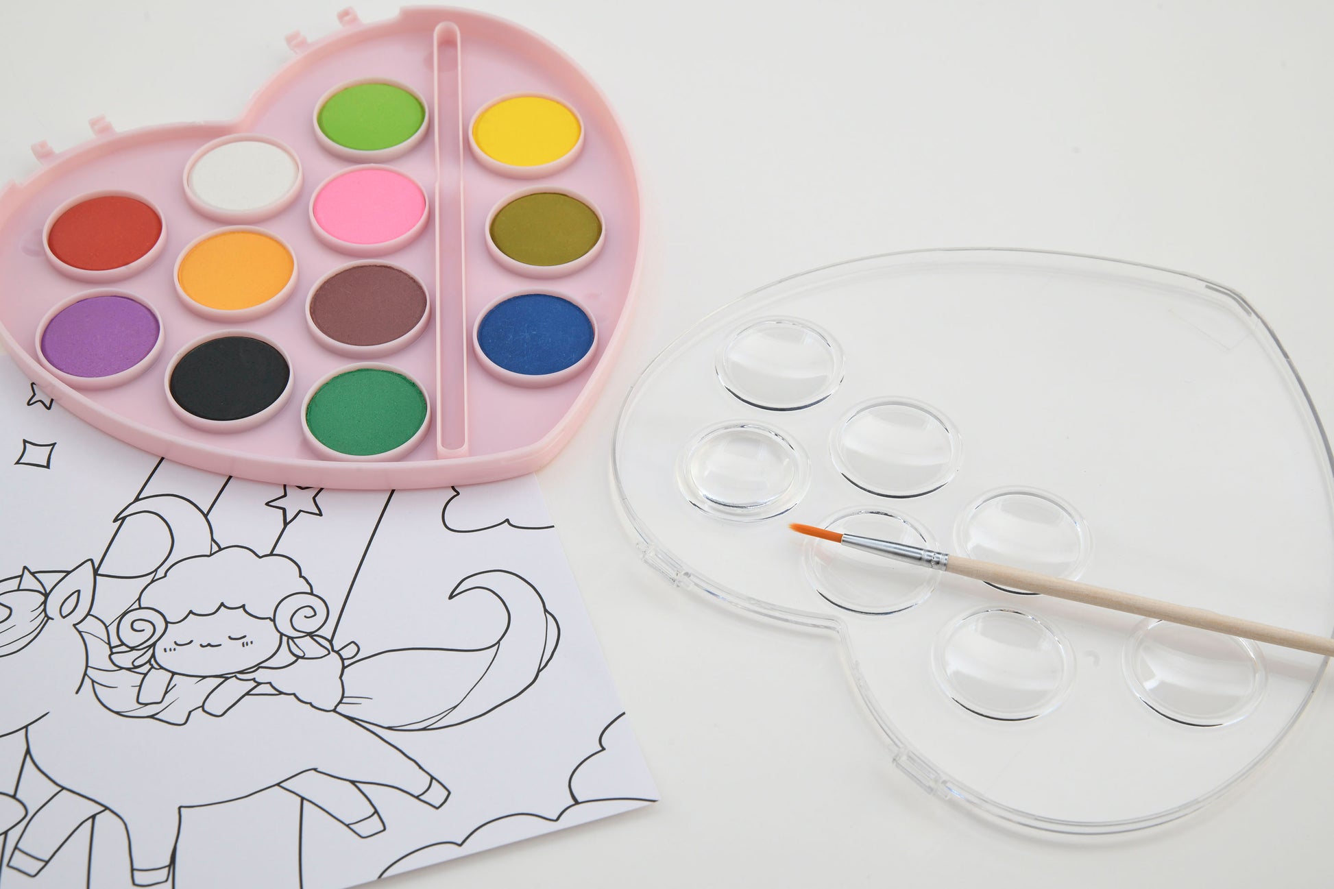 ハート型のかわいい絵の具パレットと、キュートな塗り絵のセット。絵の具は固形で、水でぬらした筆で溶いて使うもの。塗り絵もたっぷり15枚入りでお得!