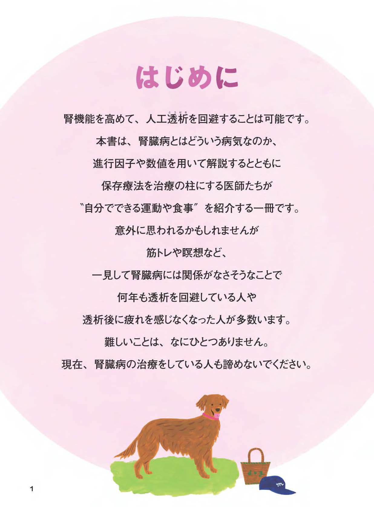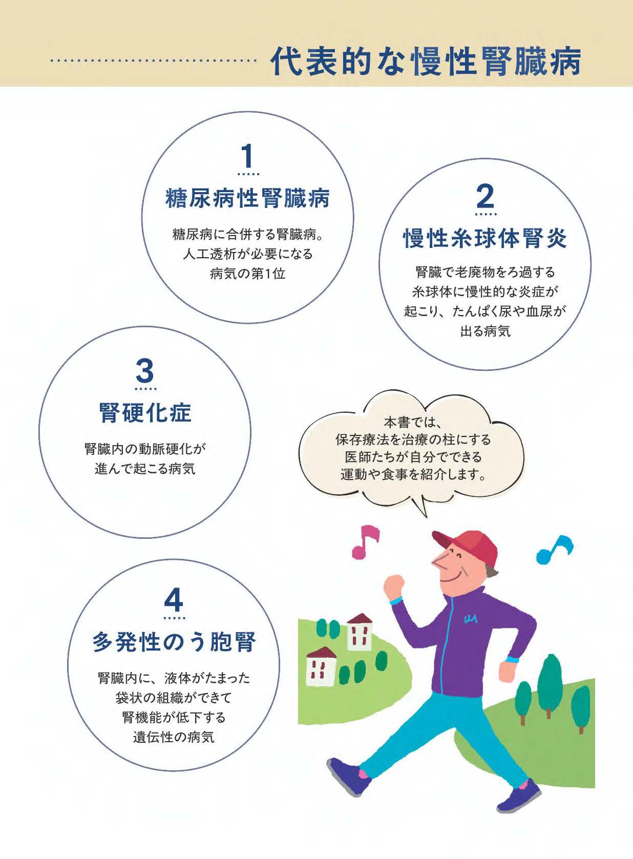 本書は、腎臓病とはどういう病気なのかを解説するとともに、保存療法を治療の柱にする医師たちが自分でできる運動や食事をご紹介します。効果的なウォーキング法や尿量を増やすのに最適な食事も掲載。難しいことは、なにひとつありません。
