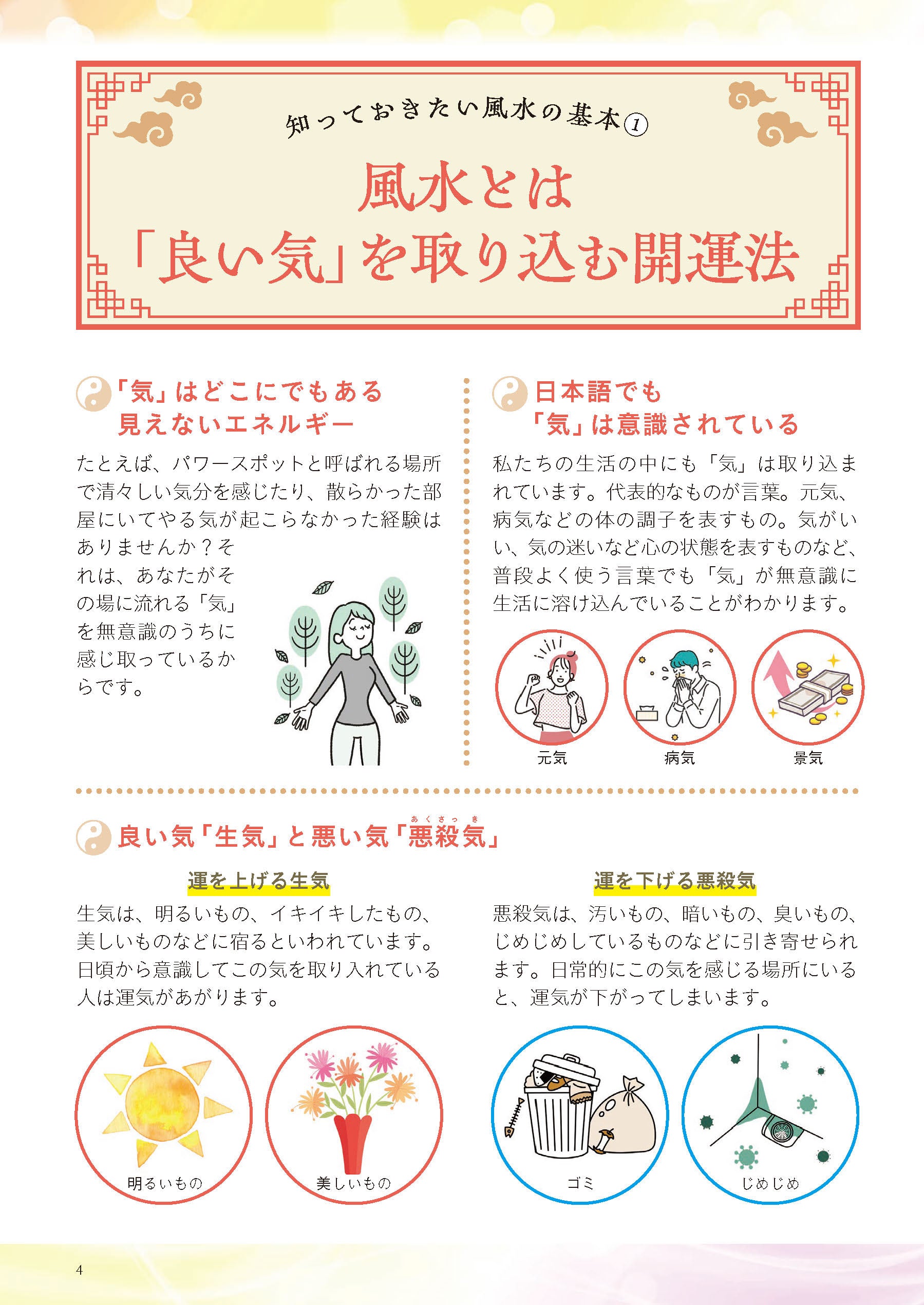 第1章では、「部屋の状態は心と運の状態を映す鏡」。風水の知恵をベースに、片づけや掃除を通じて住まいを整え、ポジティブなエネルギーを呼び込む方法を紹介。第2章では、お金・健康・人間関係・仕事など目的別に運を呼び込む風水術を紹介。それぞれ、「運がよくなる理由」を風水的に解説することで、読者のモチベーションを高めます。1年間を幸運に過ごす12ヶ月風水スケジュールも掲載。