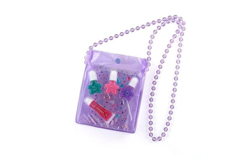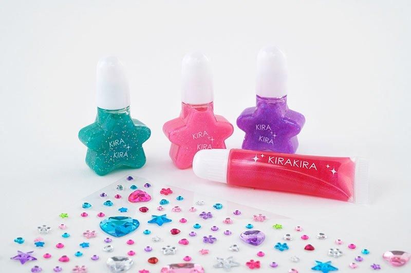 実際に使えるネイル3本とリップグロス、フェイスシール、ビニールバッグがセットになった女の子のコスメセット。リップカラーは石鹸や洗顔剤で、ネイルは水またはぬるま湯で落とせるので安心。シールは顔に貼ったり爪に貼ったり、またバッグに貼ったりも可能。ステキなおねえさんみたいにおしゃれを楽しもう!