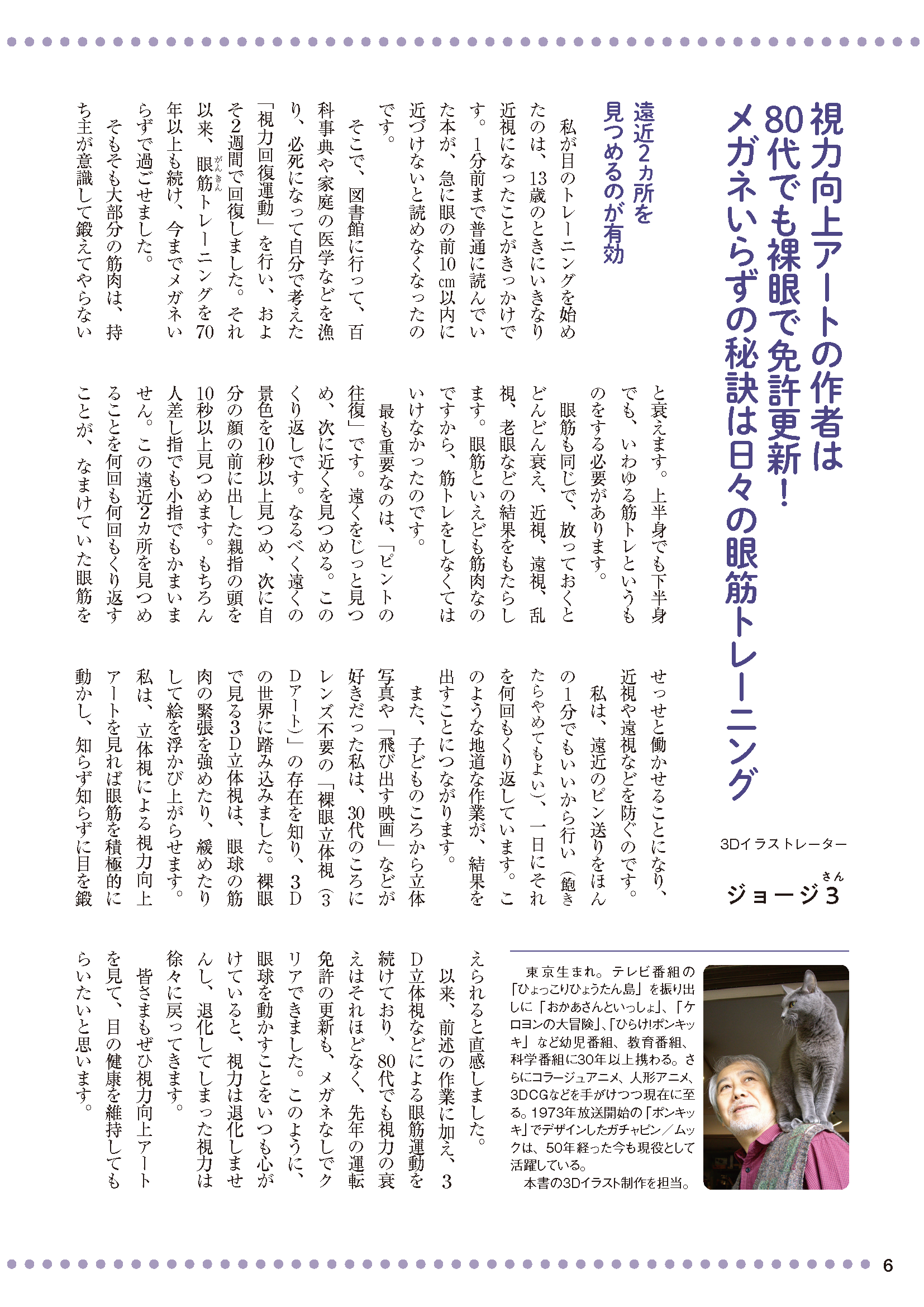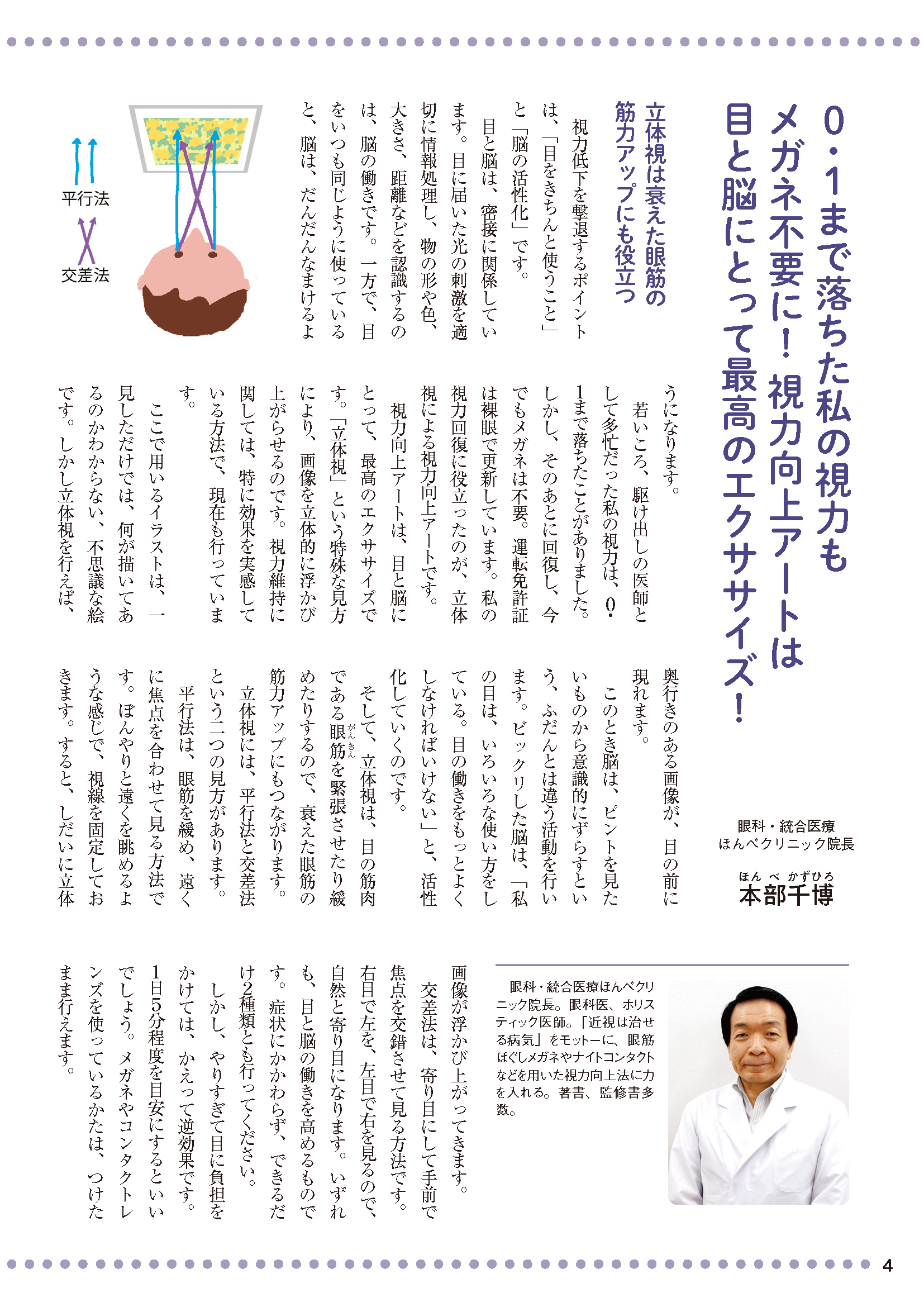 ただの模様に見えるイラストをじっと見ていると立体的な絵が浮き出てくる、立体視による視力向上アートを集めた本。視力向上アートを見ることは、目の筋肉を緊張させたり緩めたりさせるので、目にとって最高のエクササイズに。名画を見るだけで 老眼や近視を改善する作品も収載しますので、楽しみながら絵を見てトレーニングしてください。