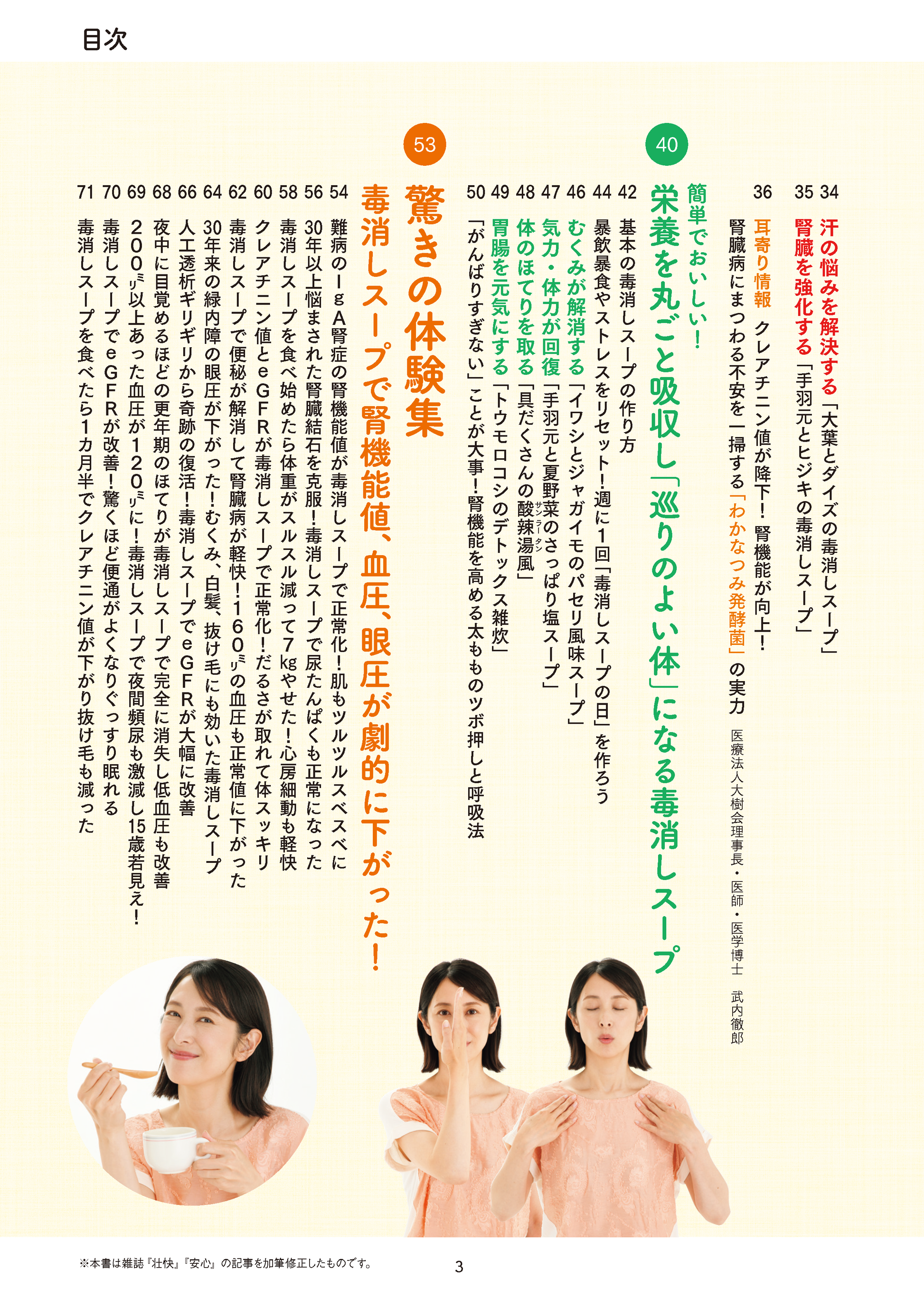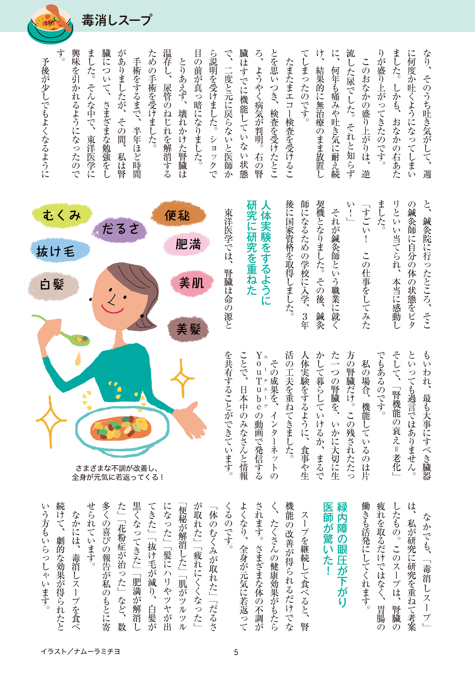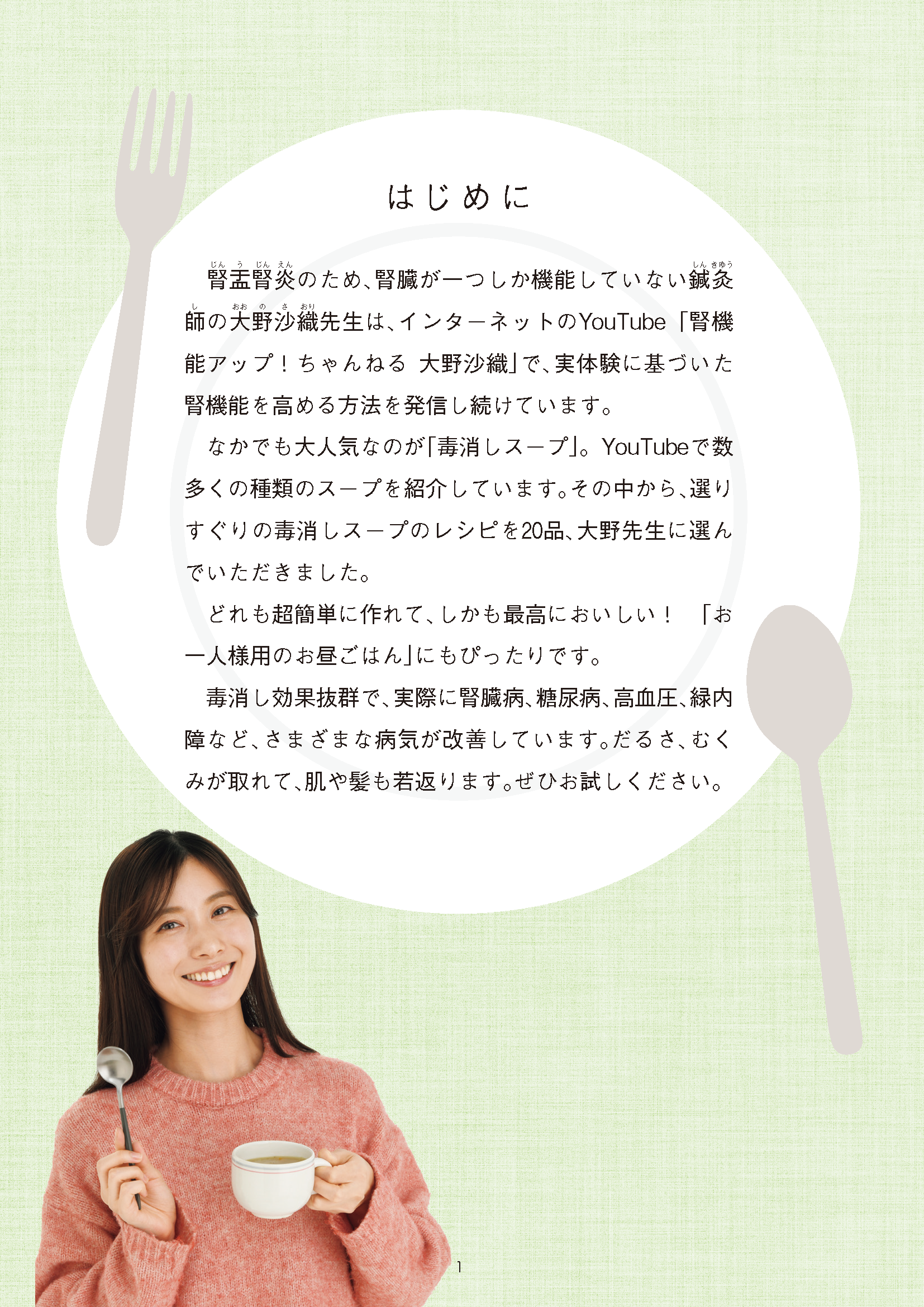 YouTube登録者数12.3万人。腎臓の働きを高めて解毒を促す「毒出しスープ」を、YouTubeで発信し、大評判に。腎機能値、血糖値、血圧、緑内障の眼圧が下がった人が続出。むくみ、だるさが取れて、肌がツルツルになり、抜け毛や白髪も減る。超簡単に作れて最高においしい特効レシピ20を紹介。