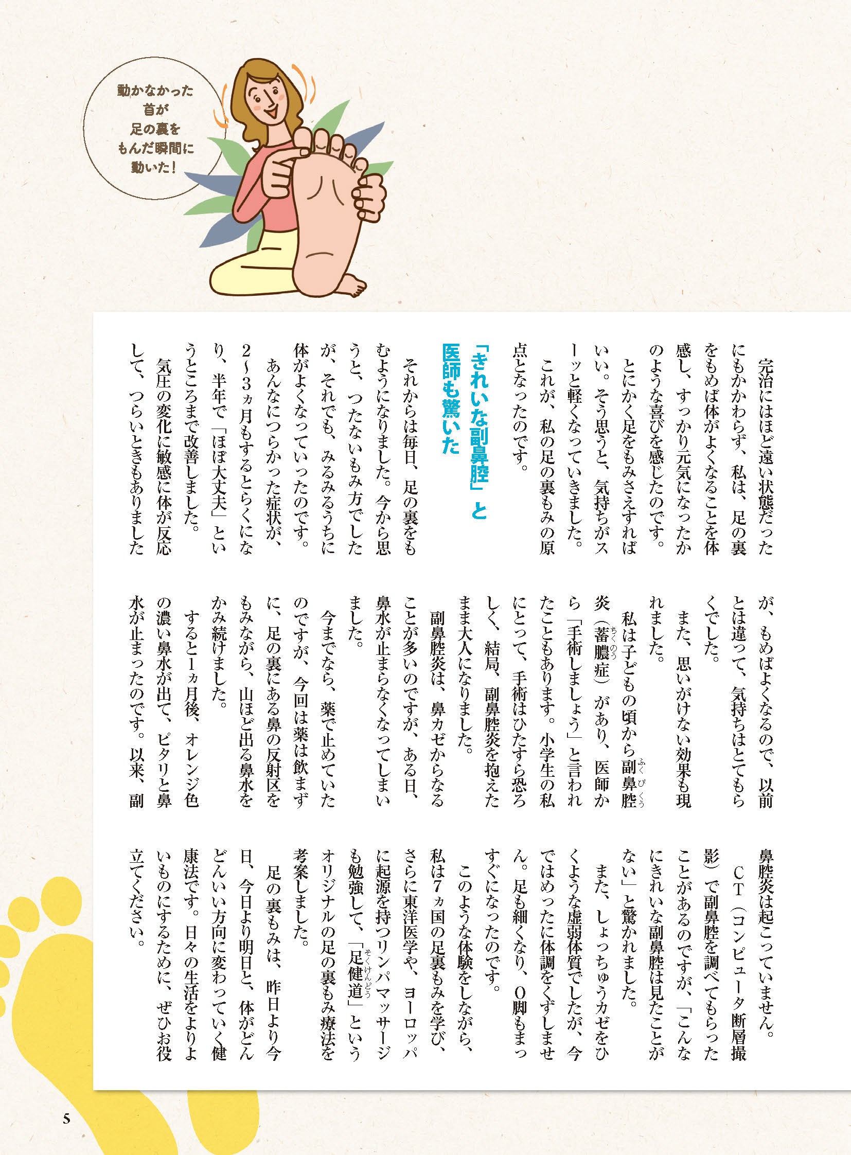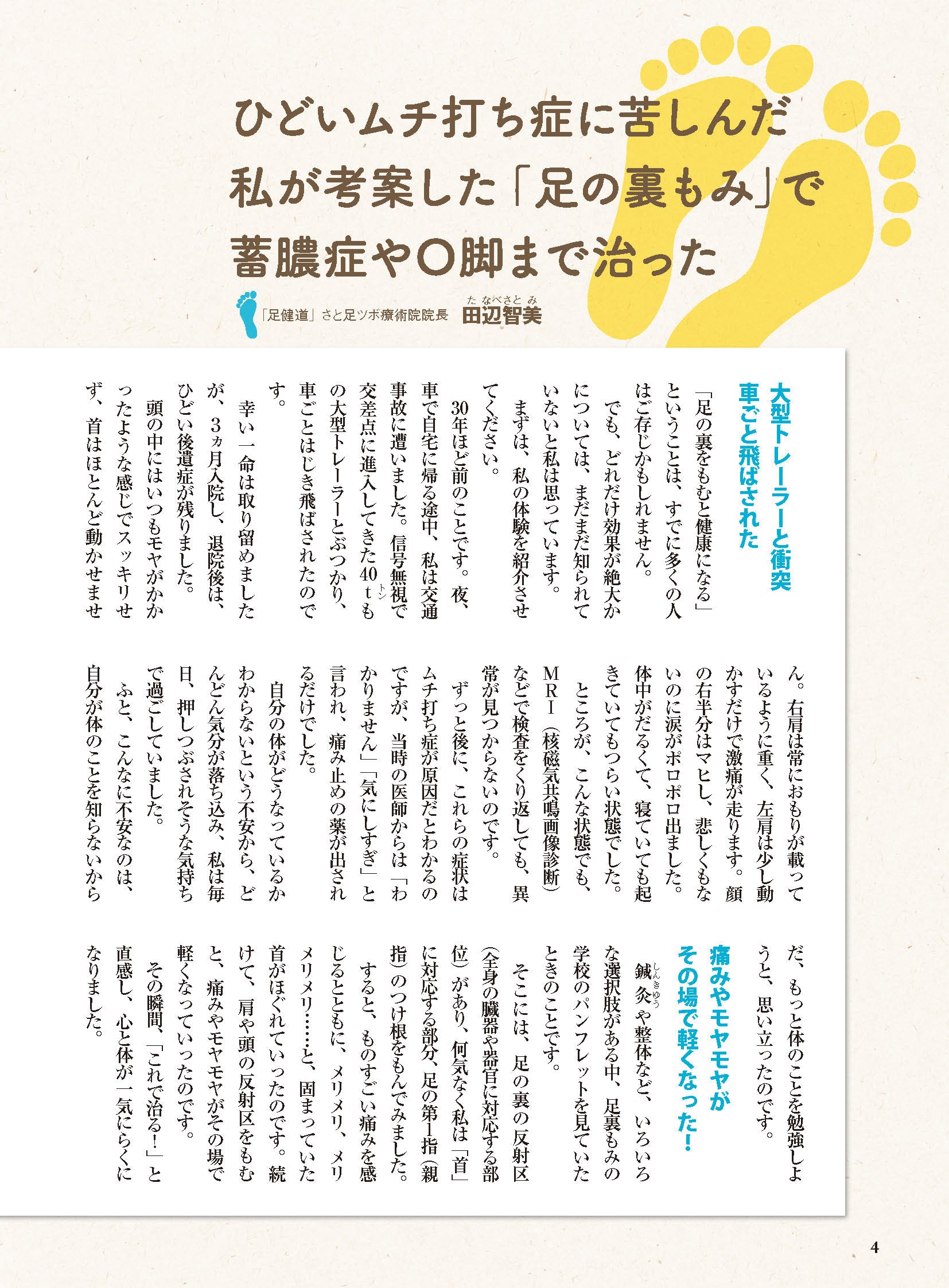 著者の田辺智美さんは28歳のとき、大型トレーラーに追突された事故により、重度のムチ打ち症を患いましたが、足の裏もみを行うことで自力で完治させました。足の裏もみのすごいところは「これで元気になれる!足の裏もみがあれば、これからの人生も大丈夫」と心にわからせてくれるところだと田辺さんは言います。