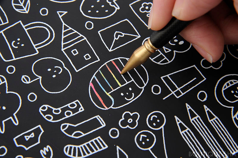 mizutamaさんのかわいいイラストがスクラッチアートに! けずって描ける、カラフル・キラキラで可愛い色とりどりのスクラッチアートシートを全16枚封入。 (黒・ピンク・青の3色のシート)細部も削れる2wayスクラッチペン付き。