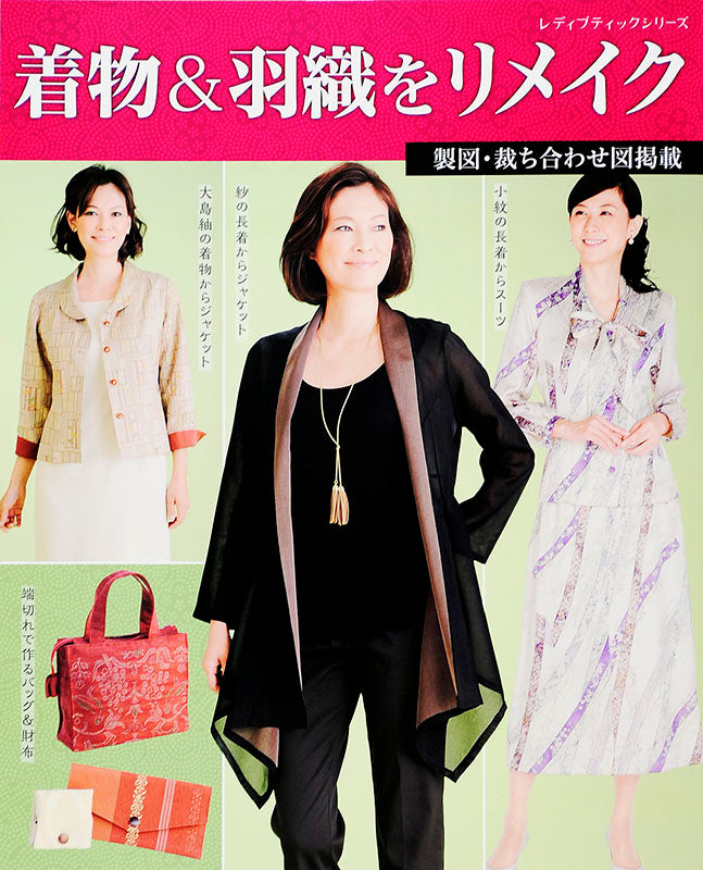 着物や羽織をお洒落で素敵にコーディネートできるアイテムにリメイク。スーツ、ブラウス、ワンピース、コート、バッグ、財布など全56点。製図、裁ち合わせ図付き。