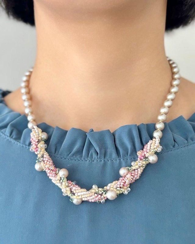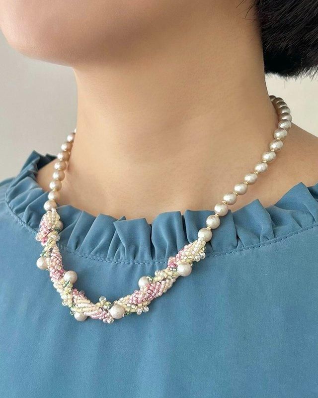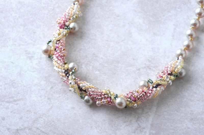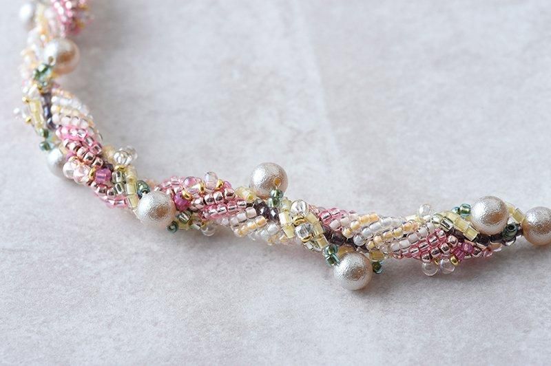 誰もが大好きな魔法のステッチとして親しまれているスパイラルロープの技法を活かし、軽やさと上品さを兼ね備えた仕上がりを目指しました。ビーズのきらめきと優しい色彩を絡めたデザインです。後部は2 段階で長さを調整できる便利な仕様になっています。