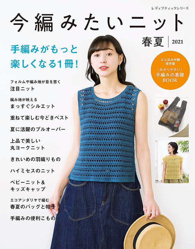 この春夏に編みたいウエアとこもの集。旬を感じるフォルムや編地の注目ニット、編み地が映えて編みやすいまっすぐシルエット、重ねて楽しむ今どきのベスト等。他にキッズ、メンズ、ハイミセスニットなど幅広く掲載。バッグ、帽子、ポーチ、マスク他、こものも充実。全80点。