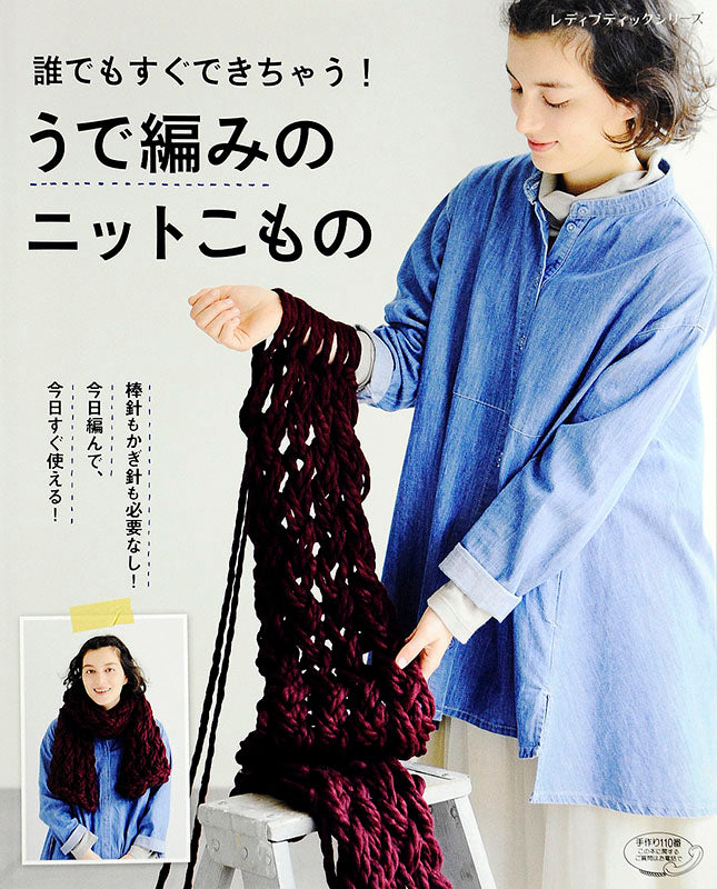 毛糸だけあれば誰でも気軽に編める「うで編み」。うで編みで、マフラー、キャップ、ショール、ネックウォーマー、スヌードなどが編める。簡単でおしゃれなアイテムを大きくてわかりやすいプロセスで紹介。