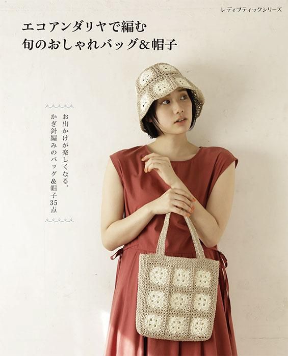 エコアンダリヤは、木材パルプを原料としたレーヨン100%の天然素材の糸。この本では、エコアンダリヤで編む春夏にぴったりのバッグと帽子をご紹介。カジュアルなコーディネートに合うシンプルなデザインから、ワンピースやスカートに合う上品なものまで掲載。