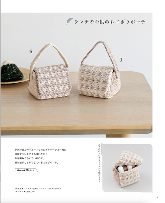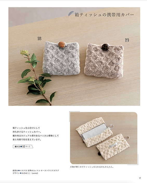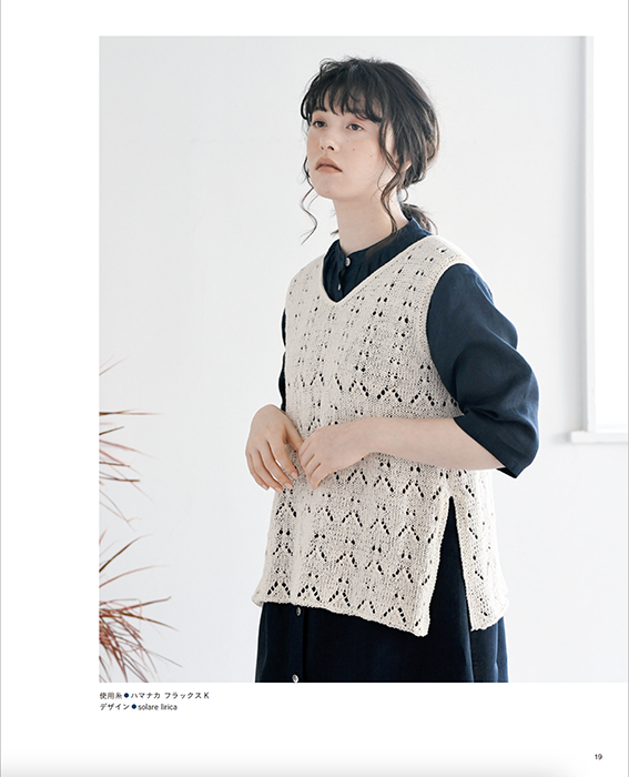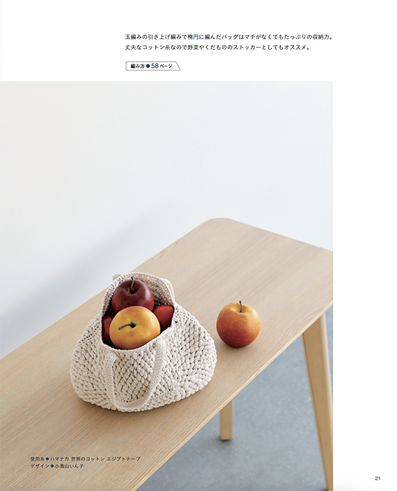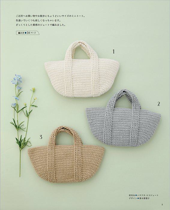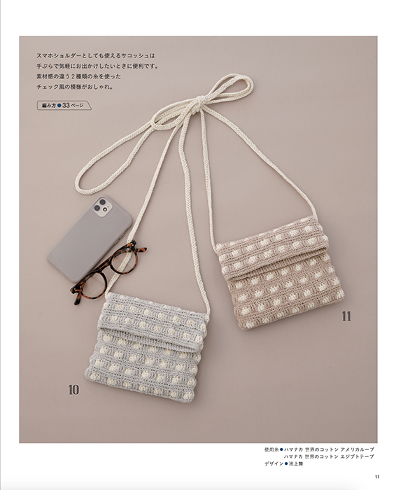 生成り色と人気のニュアンスのあるくすみカラーの糸で編む、こものとウエアを集めた1冊。こものはつけ衿、ミニトート、サコッシュ、きんちゃくバッグ、あみぐるみ、靴下など。ウエアはプルオーバーやベスト、カーディガンなど。