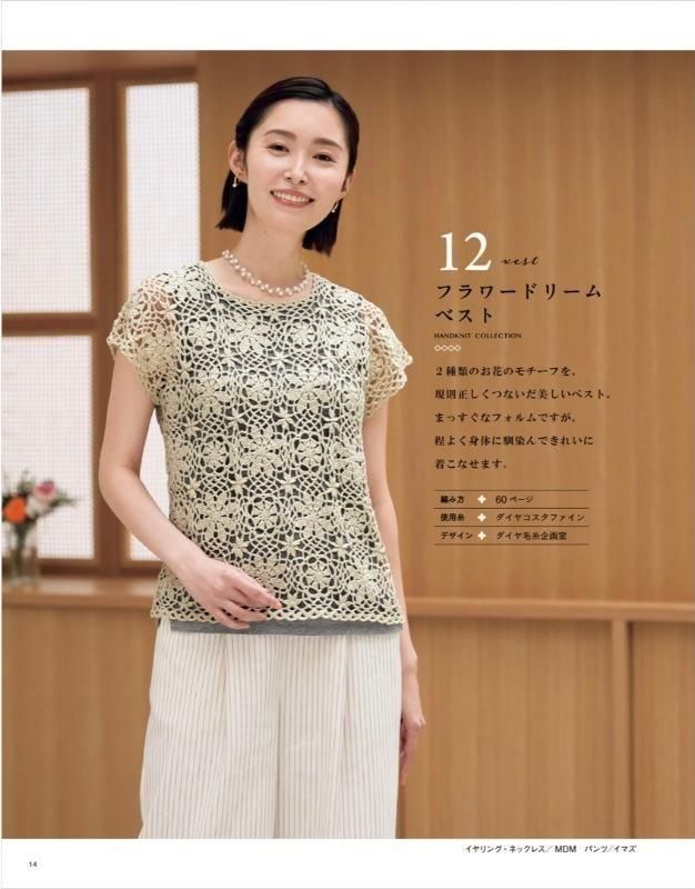 春夏手編みニット作品集。ベスト、プルオーバー、カーディガン、小物など全27点。レーシーな模様編み、重ね着を楽しめるベストなど、程よく流行を意識したデザインから、編みごたえのある作品まで掲載。こだわりの糸で編んだ、大人に似合う素敵なニットをご紹介。写真も編み図も見やすい大判サイズの本。