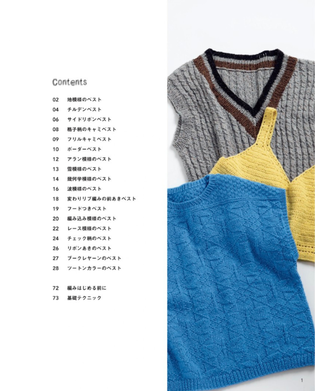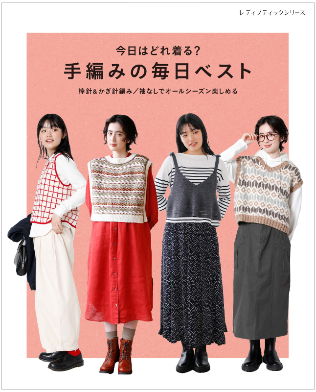 袖つけがないベストは、気軽に編める上に素材を替えればオールシーズン楽しめる優秀アイテム。合わせるお洋服でコーデの幅が広がるのも魅力!棒針とかぎ針の作品を全24点掲載。