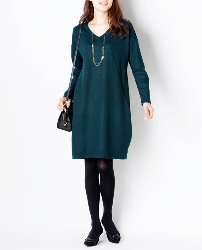 ヒップラインに丸みを持たせた「コクーンシルエット」が可愛いワンピースの型紙 脇から鋭角に入ったダーツを利用してシームポケットにし、袖はゆったり着られるドロップショルダーになっています。柔らかく女性らしいコクーンシルエットは可愛らしい雰囲気に印象付けて。無地で作ればアクセサリーなどの小物使いも映えます。チュニック感覚でも着られるので、寒い時期は下にインナーとスリムジーンズを合わせた着こなしを楽しんで。 ダボっとしていないのに、ゆったり着られるのが魅力的なワンピース 腰回りはゆとりがあって体型カバーもでき、動きやすくて機能的。袖は細めのデザインですが、ドロップショルダーになっているので、案外腕も動かしやすく、圧縮ウールや、伸縮性のある生地で作れば窮屈さも感じません。 ◾︎デザイン◾︎[ワンピース]あき……………あきなし前身頃…………脇から上に向かって長く入るダーツ。ダーツを利用したポケット付き後ろ身頃………裾に切り替えがあり、裾が丸みのあるシエットに袖………………長袖、ドロップショルダー衿………………広めのVネック(見返し仕立て) ※こちらのデザインは過去に雑誌「レディブティック」に掲載された作品です。通常価格 ¥770~¥1,650セール価格 ¥770〜 通常価格単価 あたり -