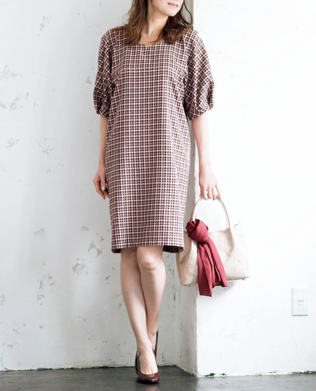 タックでふんわりと膨らませたボリュームスリーブのワンピース 気負わないのに上品なデザインできちんとしたシーンにも着ていけるワンピース。キュッとすぼまったスイートハートネックラインもキュート。タックでふんわりと膨らませたボリュームスリーブ、首元は着脱しやすいようにスリットあきにボタンがついたデザインです。半袖で過ごすには肌寒い時期には、こなれ感の漂うレイヤードスタイルの着こなしもオススメ。ボトムにスリムパンツを合わせてチュニック感覚でも着ることができます。 少し変わった形の型紙に注目! 前見頃のヨーク切り替え線から袖までがひと続きになった型紙で、肩周りが柔らかい印象に。後ろから見るとラグランスリーブの切り替えになっています。一見難しそうに見えても、丁寧なイラスト付きの作り方がついているので、安心です。 ◾︎デザイン◾︎[ワンピース]あき……後ろ衿ぐりに布ループのボタンあき(スリットあき)身頃……後ろ裾に短いスリット袖………半袖、ラグランスリーブ(前はヨーク切り替えから続く、変形ラグランスリーブです)袖口タック衿………ハートネックライン(見返し仕立て) ※こちらのデザインは過去に雑誌「レディブティック」に掲載された作品です。通常価格 ¥770~¥1,650セール価格 ¥770〜 通常価格単価 あたり -