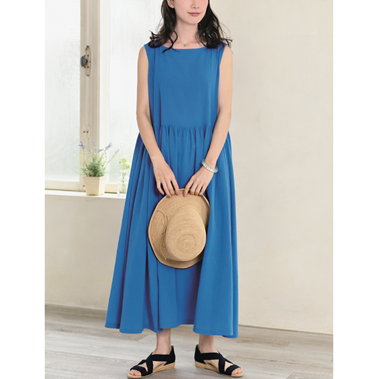セルリアンブルーが目を引くノースリーブワンピースは、しわ加工を施した柔らかなボイルをたっぷり使ったデザイン。