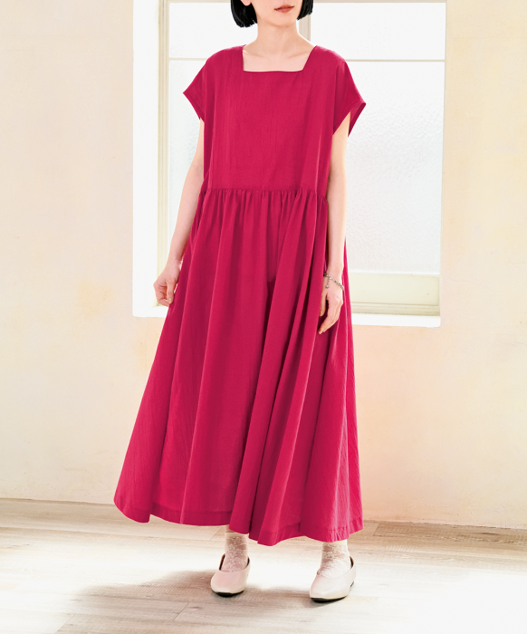 歩くたびにふわっと揺れるシルエットが魅力的な、フレンチ袖のワンピース。スクエアネックで首回りもすっきり。