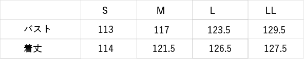 【着丈】114cm/ 121.5cm/ 126.5cm/ 127.5cm