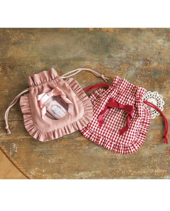 中身が見えるビニールの窓付き巾着。まわりにフリルをあしらった丸みのあるフォルムがキュートです。窓の部分にはサテンリボンを立体的に縫い付けてアクセントに。