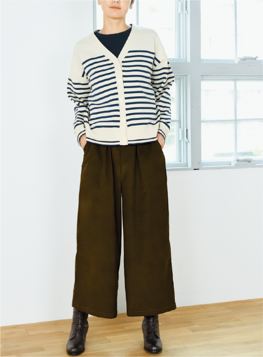 カジュアルな着こなしに活躍するワイドパンツ。普段にもちょっとした外出にもぴったりなダークカーキの細コールを使用。素材を替えて何枚も作りたくなるシンプルなデザインです。