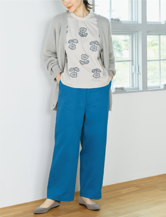 ーディネートの主役になる、ターコイズブルーのハーフリネンツイルを使用しました。