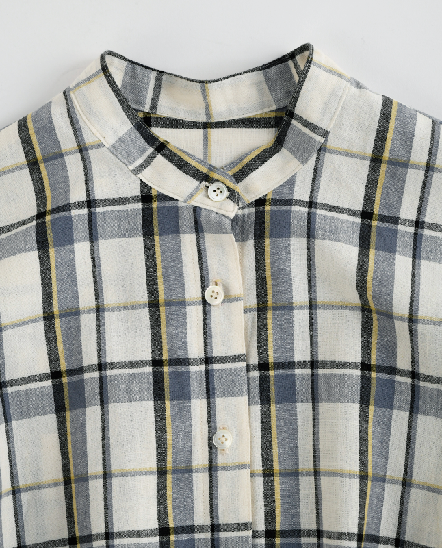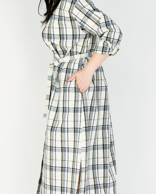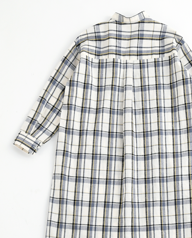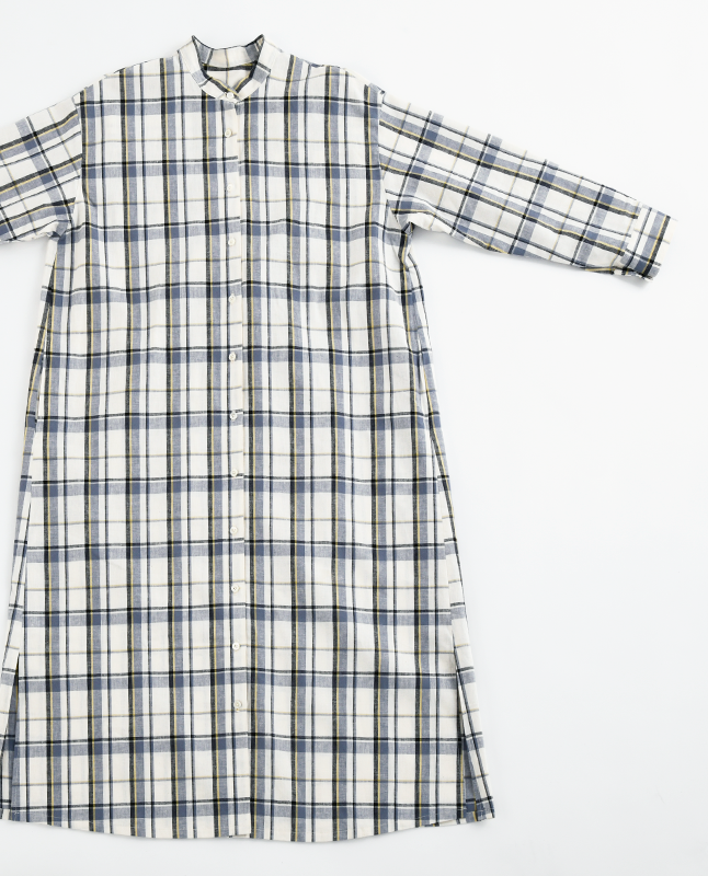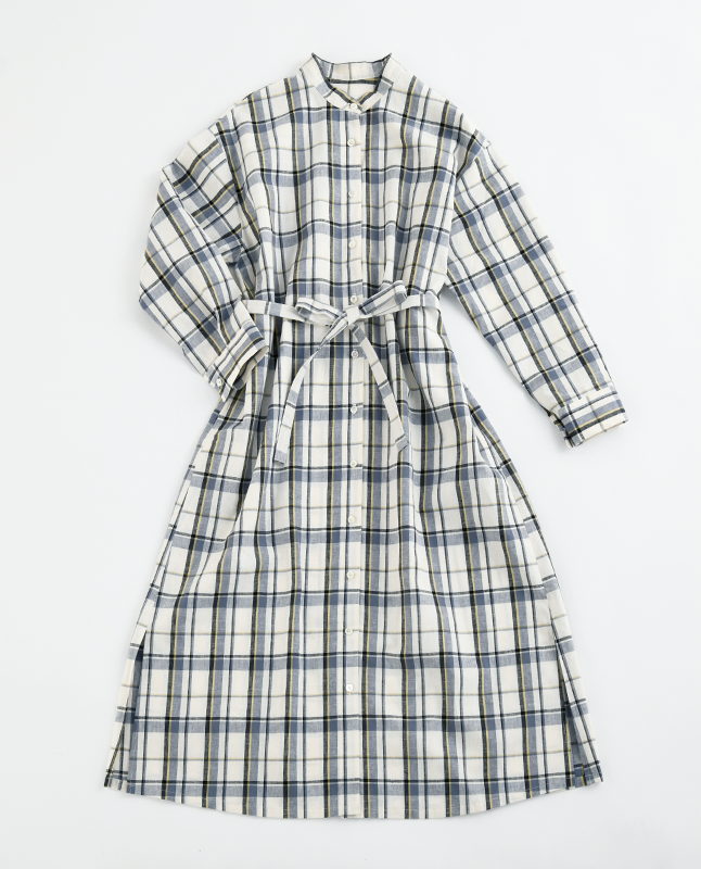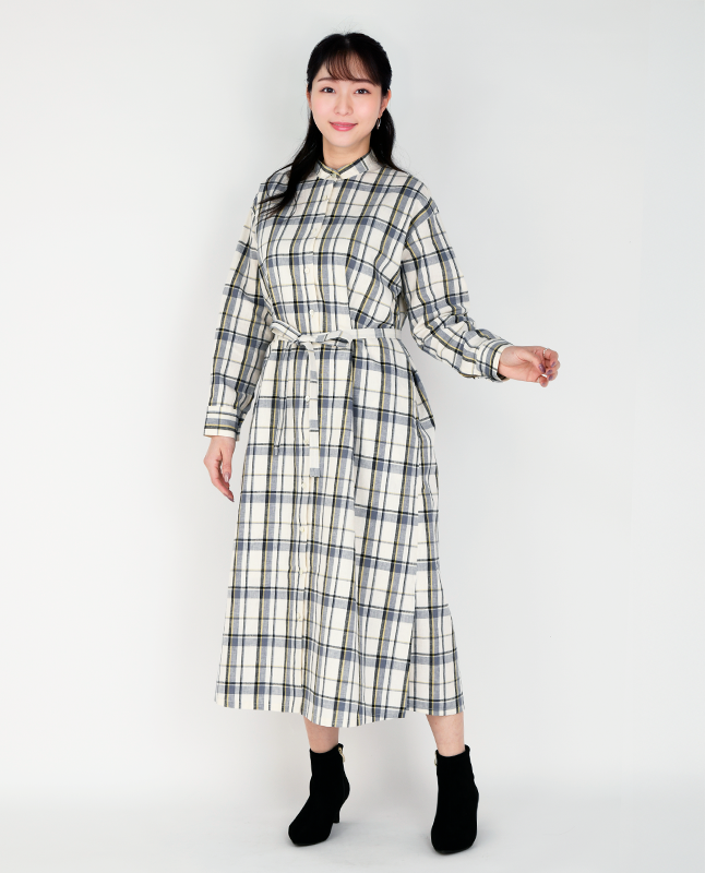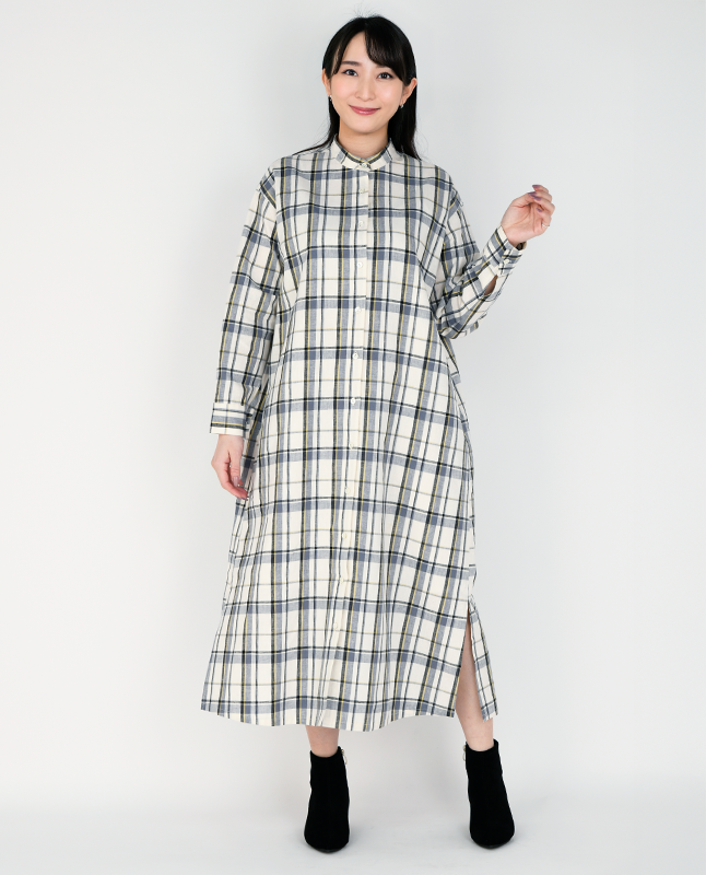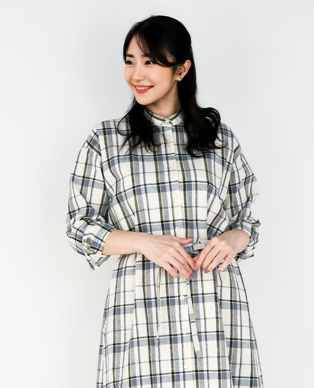 スタンドカラーのシャツワンピースは一枚で着るのはもちろん、前を開けて羽織りとしても使えるので着回し力抜群です。