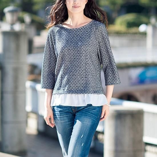 衿ぐりの形と袖丈の絶妙なバランスが、 すっきりきれいに見えるポイント 裾にフリルのついた、ラグランスリーブのブラウス。裾を折り返した少し内側にフリルが付くので、重ね着しているように見えるデザインです。衿ぐりは共布の縁取り始末です。※衿ぐり周りのあきにあまり余裕のないデザインなので、必ず伸縮のある布地を使用して製作してください。 ※こちらのデザインは過去に 雑誌「レディブティック」に掲載された作品です。通常価格 ¥660~¥1,320セール価格 ¥660〜 通常価格単価 あたり -