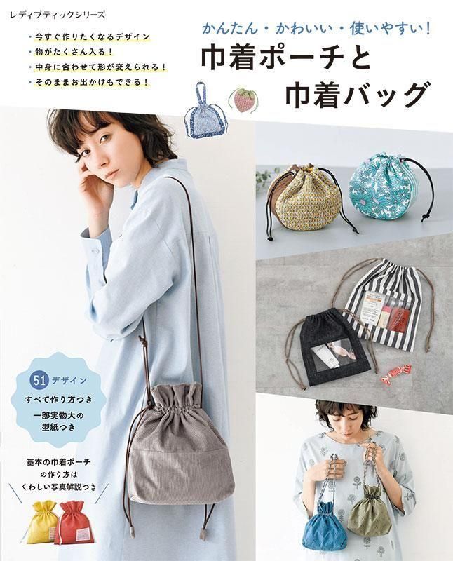 かんたんに作れて、かわいくて使いやすい巾着タイプのポーチとバッグの本。1枚でまっすぐ縫って作るシンプルなものから、裏布つき、マチつき、形のアレンジ、バッグのバリエーションなど、使いやすくておしゃれなデザインを掲載。基本の巾着ポーチの作り方をプロセス写真解説つきで紹介。
