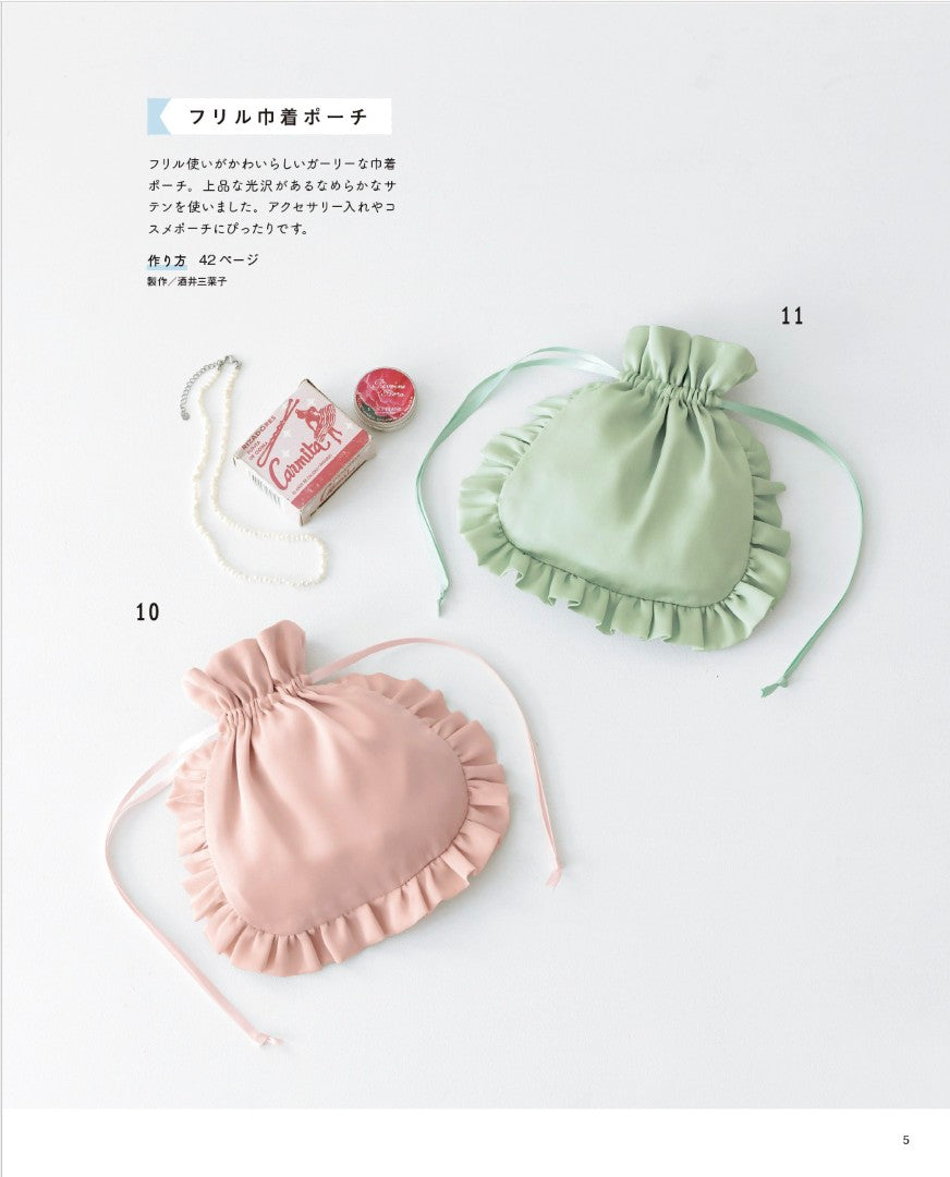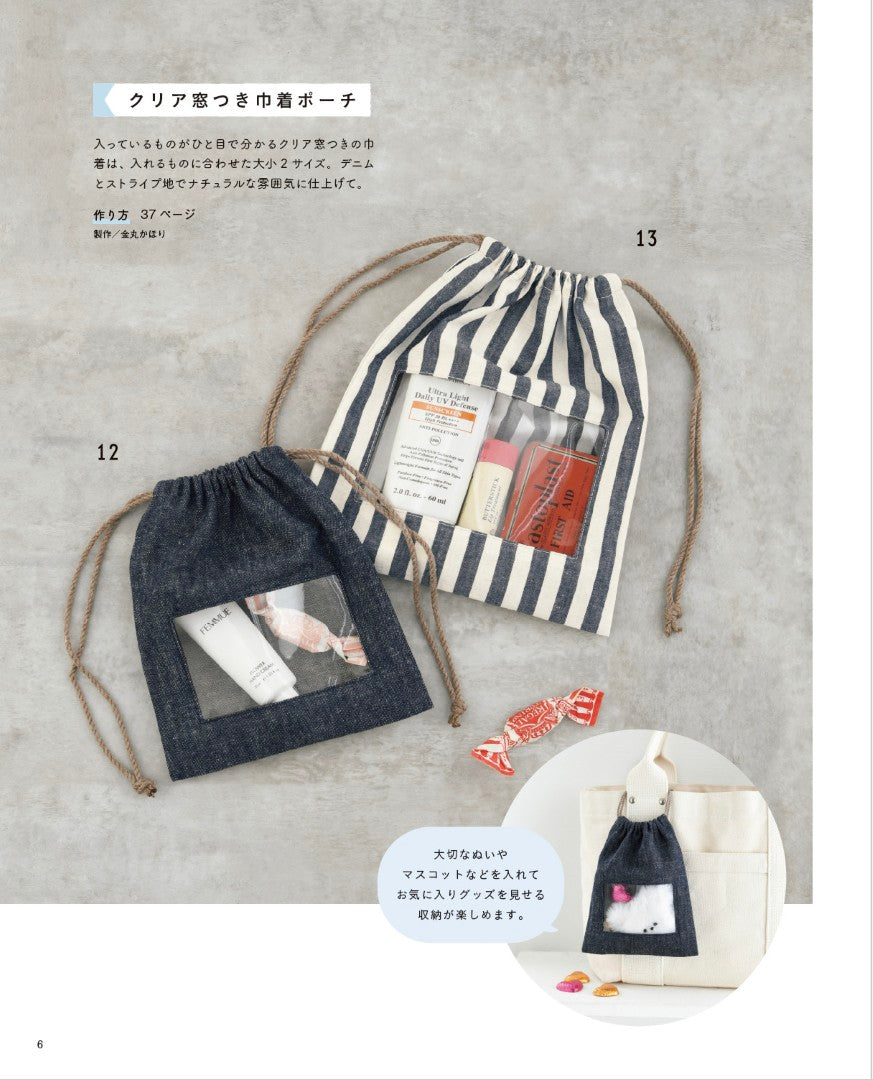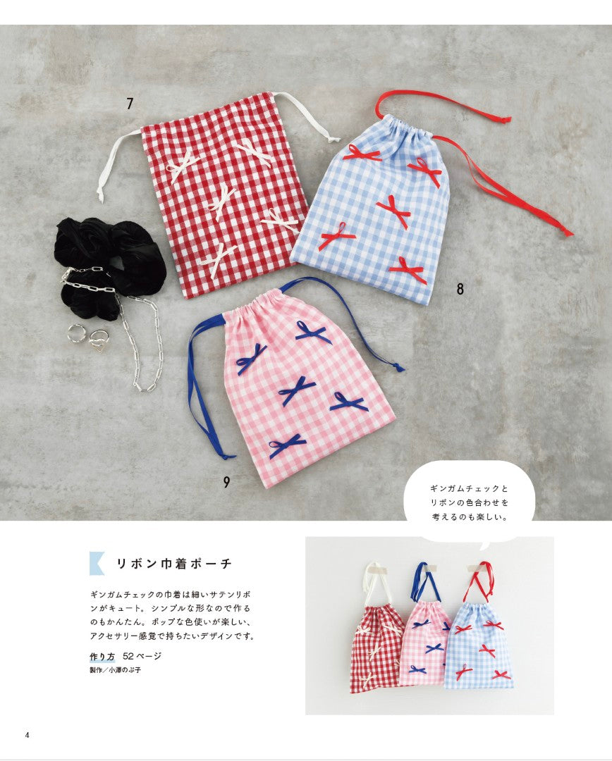 かんたんに作れて、かわいくて使いやすい巾着タイプのポーチとバッグの本。1枚でまっすぐ縫って作るシンプルなものから、裏布つき、マチつき、形のアレンジ、バッグのバリエーションなど、使いやすくておしゃれなデザインを掲載。基本の巾着ポーチの作り方をプロセス写真解説つきで紹介。