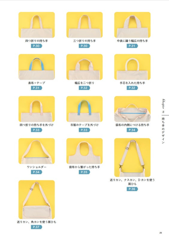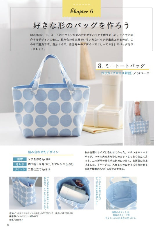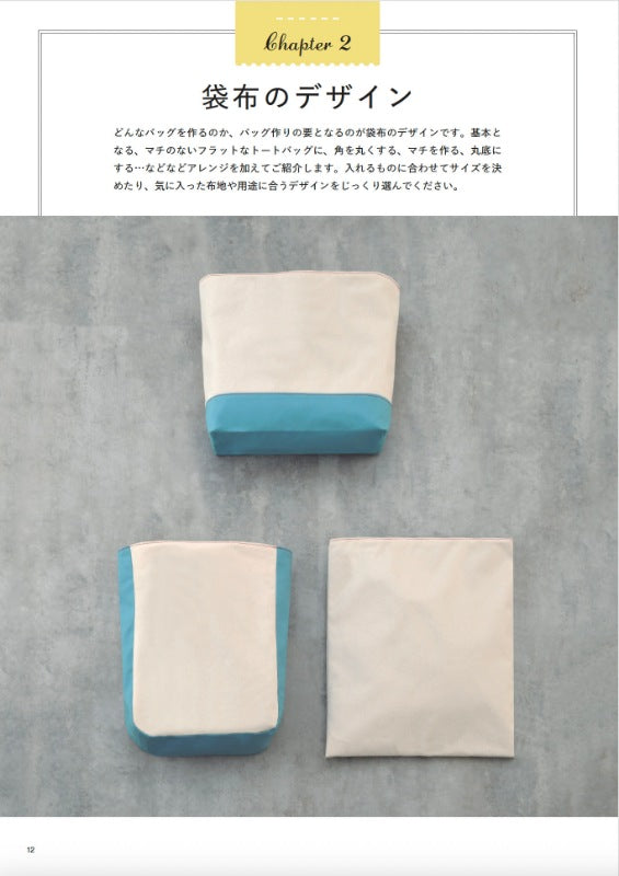 Chapter 1でバッグの基本を学び、chapter 2の袋布、chapter 3の持ち手、chapter 4入れ口、chapter 5のポケットのデザインを自由に組み合わせれば、オリジナルのバッグができる本。