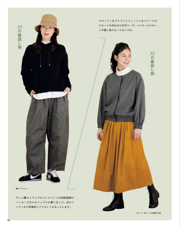 トレンドを程よく加味した、着やすくて作りやすい大人服を紹介。オールインワン、ジャンパースカート、ワンピース、アウター、トップスなどのウエアに加え、バッグやヘアアクセなど、こものも充実。全75点掲載。実物大の型紙つき、詳しい作り方解説つきで初心者さんも安心。