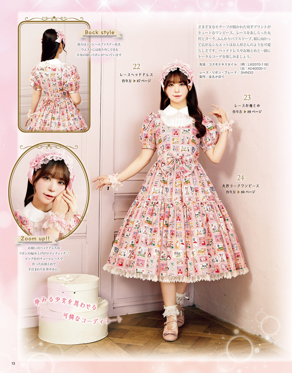 ロマンチックな懐古ロリータ、ゴシックロリータスタイル、心ときめくスウィートロリータ、ノスタルジックなカントリースタイル、ヒストリカルドレス、乙女のハンドメイドこもの、パンチニードルのくまチャームなど、リボンやレースがたっぷりの可愛らしいお洋服が大好きな女の子のための一冊。一部実物大の型紙つき。S・M・Lの3サイズ展開。
