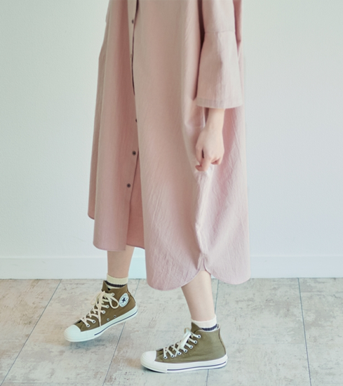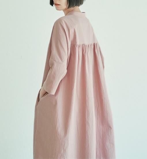 上衿なしのバンドカラーシャツ。ポケット付きでゆったり着られるデザインです。自分好みの生地や柄をチョイスして楽しんでください。