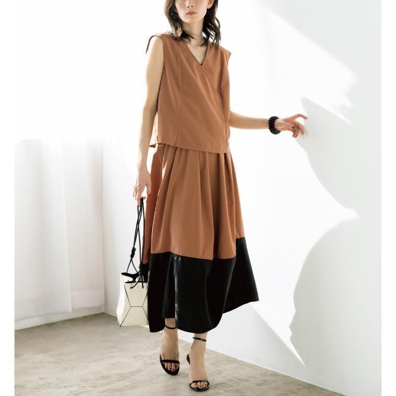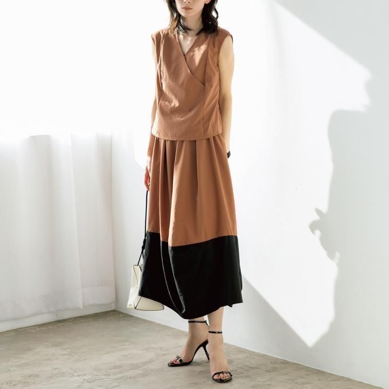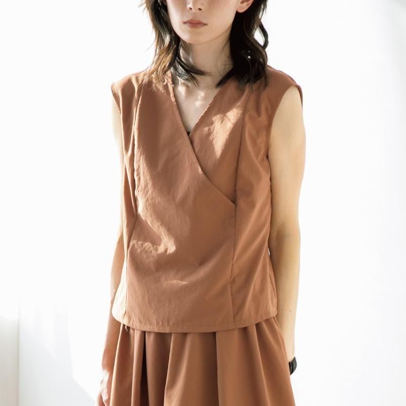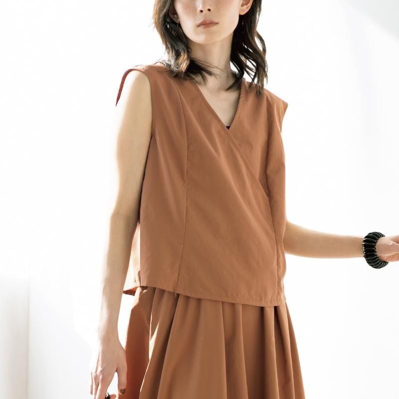 重なりのある胸元のデザインと脇の切り替えで、着た時のシルエットが美しく見えるノースリーブトップス。