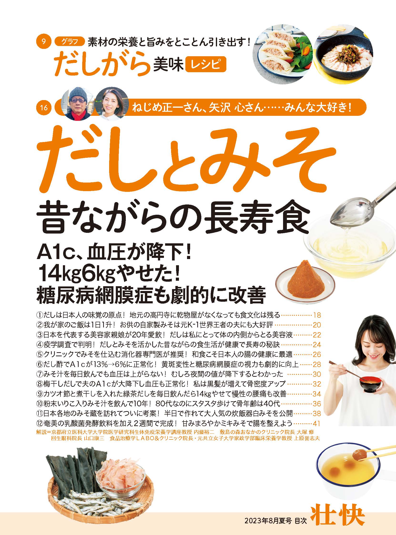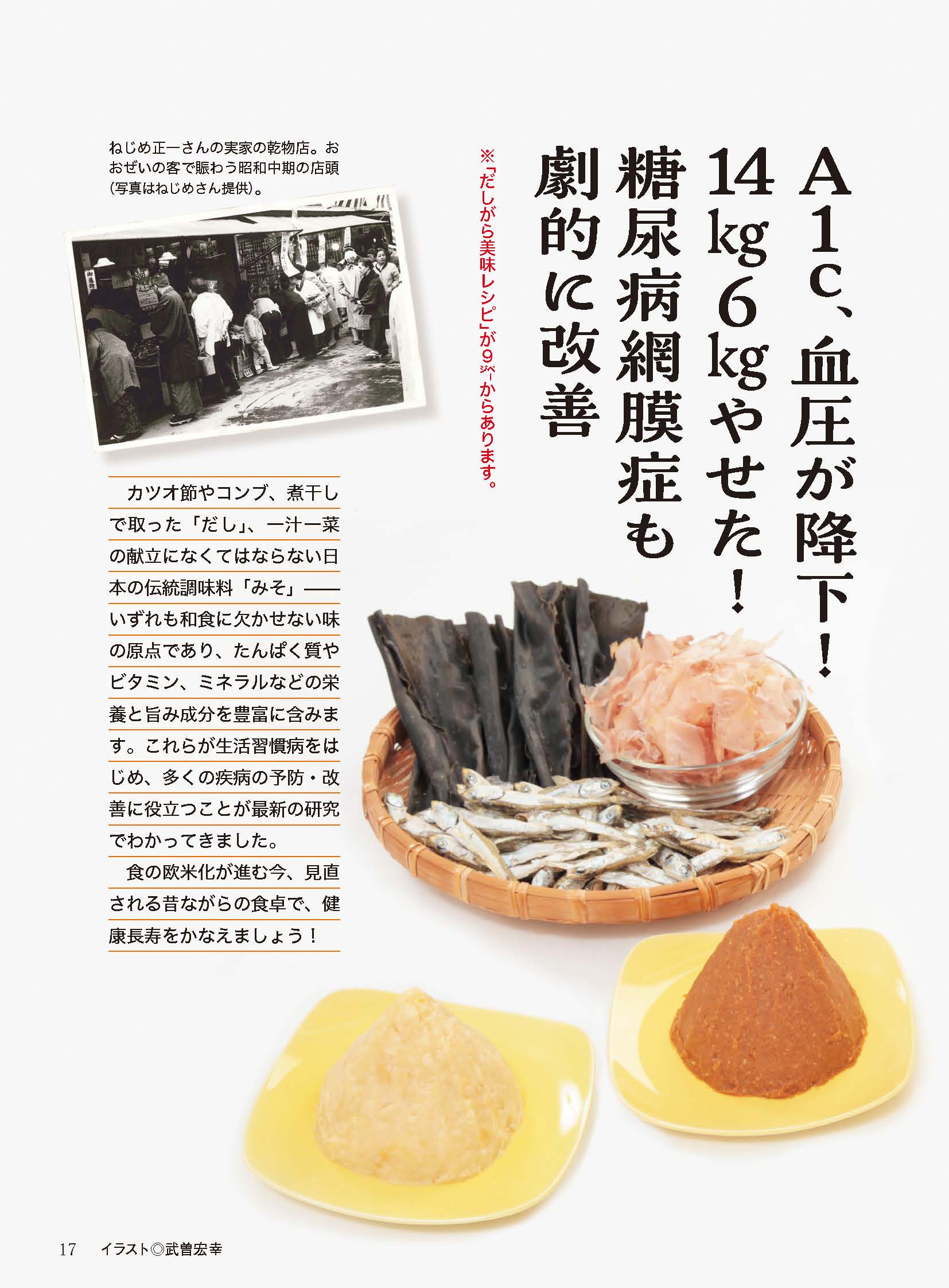 「だしとみそ」昔ながらの長寿食、薄毛・白髪・ぺたんこ髪の特効セルフケア、耳鳴り・めまい・難聴は治せる!など。別冊付録:糖尿病・腎臓病・高血圧が薬に頼らず大改善!「血液サラサラ術」小冊子つき。
