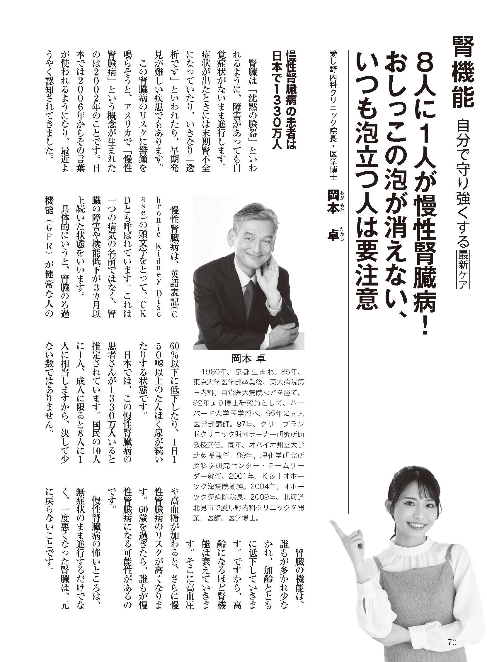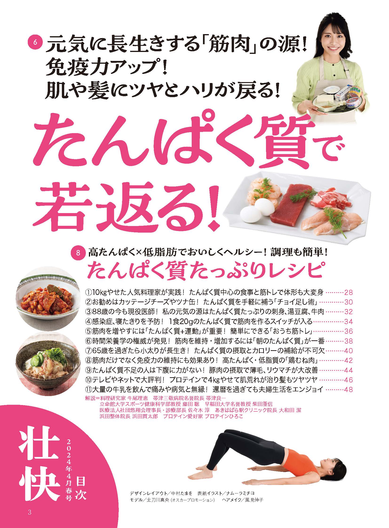 100歳まで歩ける!たんぱく質で若返る/80代でベターッと開脚!生命の貯蓄体操/腎機能 自分で守り強くする最新ケア/1日3杯のコーヒーで超健康になる/尿酸値はビタミンCで簡単に下がるなど。